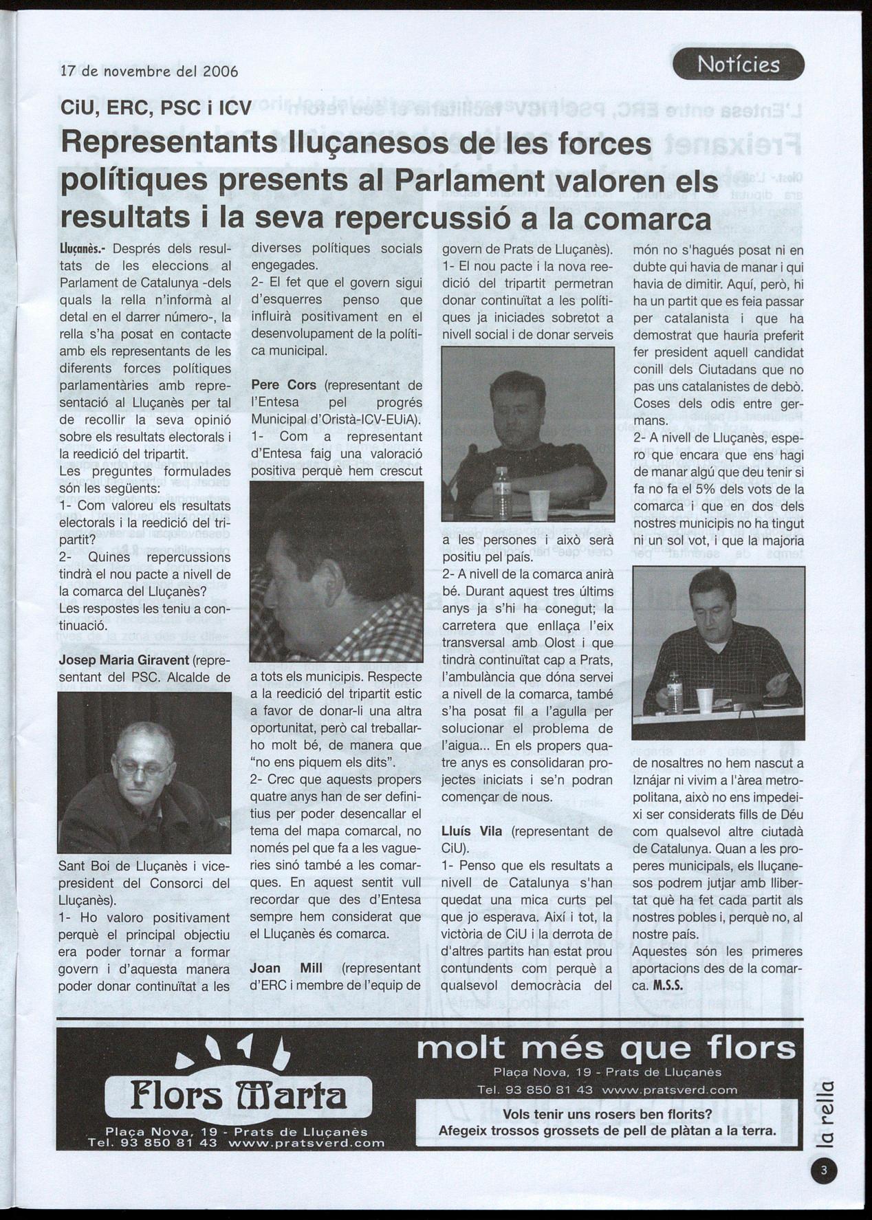 Llu�anès.- Després dels resultats de les eleccions al Parlament de Catalunya -dels quals la rella n'informà al detal en el darrer número-, la rella s'ha posat en contacte amb els representants de les diferents forces polítiques parlamentàries amb representació al Lluçanès per tal de recollir la seva opinió sobre els resultats electorals la reedició del tripartit. Les preguntes formulades són les següents: