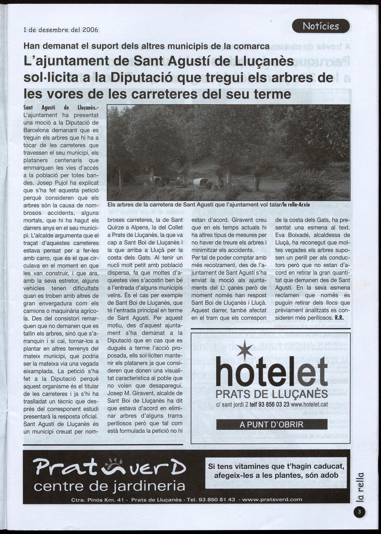 Sant Agustí de Lluçanès.L'ajuntament ha presentat una moció a la Diputació de Barcelona demanant que es treguin els arbres que hi ha a tocar de les carreteres que travessen el seu municipi, els plataners centenaris que emmarquen les vies d'accés a ía població per totes bandes. Josep Pujol ha explicat que s'ha fet aquesta petició perquè consideren que els arbres són la causa de nombrosos accidents, alguns mortals, que hi ha hagut els darrers anys en el seu municipi. L'alcalde argumenta que el traçat d'aquestes carreteres estava pensat per a fer-les amb carro, que és el que circulava en el moment en que les van construir, que ara, amb la seva estretor, alguns vehicles tenen dificultats quan es troben amb altres de gran envergadura com els camions o maquinària agrícola. Des del consistori remarquen que no demanen que es tallin els arbres, sinó que s'arranquin i si cal, tornar-los a plantar en altres terrenys del mateix municipi, que podria ser la mateixa via una vegada eixamplada. La petició s'ha fet a la Diputació perquè aquest organisme és el titular de les carreteres ja s'hi ha traslladat un tècnic que després del corresponent estudi presentarà la resposta oficial. Sant Agustí de Lluçanès és un municipi creuat per nom-