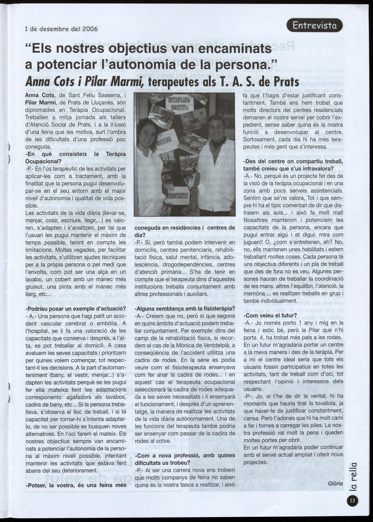 Anna Cots, de Sant Feliu Sasserra, i Pilar Marmi, de Prats de Lluçanès, són diplomades en Teràpia Ocupacional. Treballen a mitja jornada als tallers d'Atenció Social de Prats de Lluçanès
