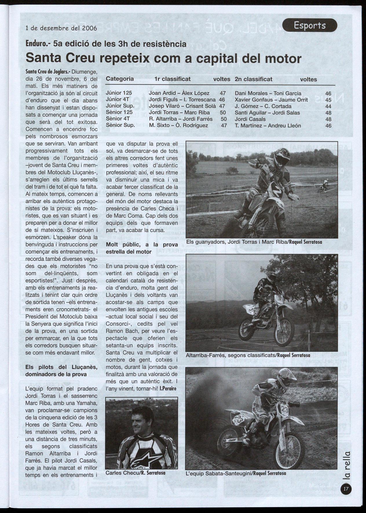 Jordi Torras el sasserrenc Marc Riba, amb una Yamaha, van proclamar-se campions de la cinquena edició de les 3 Hores de Santa Creu. Amb les mateixes voltes, però a una distància de tres minuts, els segons classificats