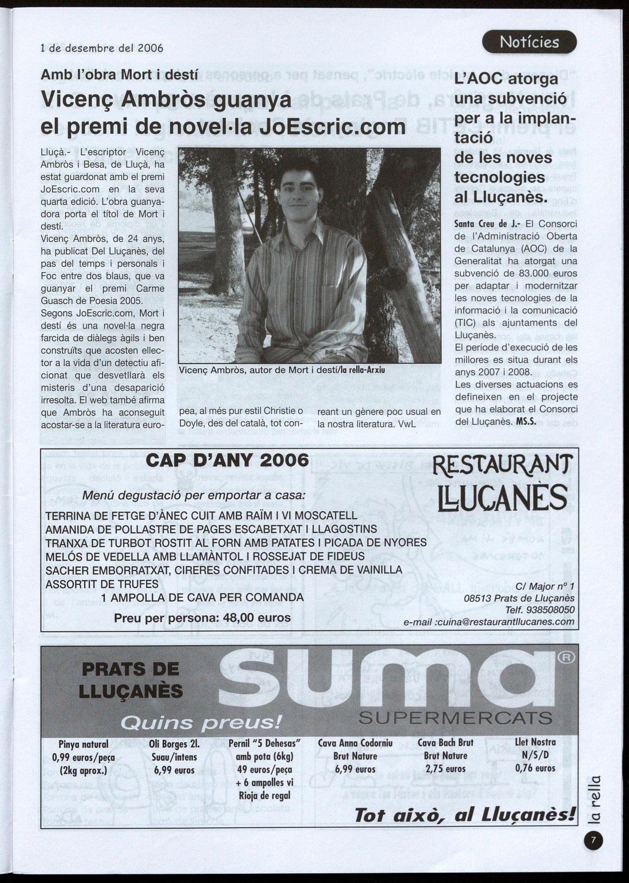 Vicenç Ambròs, de 24 anys, ha publicat Del Lluçanès, del pas del temps i personals i Foc entre dos blaus, que va guanyar el premi Carme Guasch de Poesia 2005. Segons JoEscric.com, Mort i destí és una novel·la negra farcida de diàlegs àgils ben construïts que acosten ellector a la vida d'un detectiu aficionat que desvetllarà els misteris d'una desaparició irresolta. El web també afirma que Ambròs ha aconseguit pea, al més pur estil Christie o reant un gènere poc usual en acostar-se a la literatura euro- Doyle, des del català, tot con- la nostra literatura. VwL