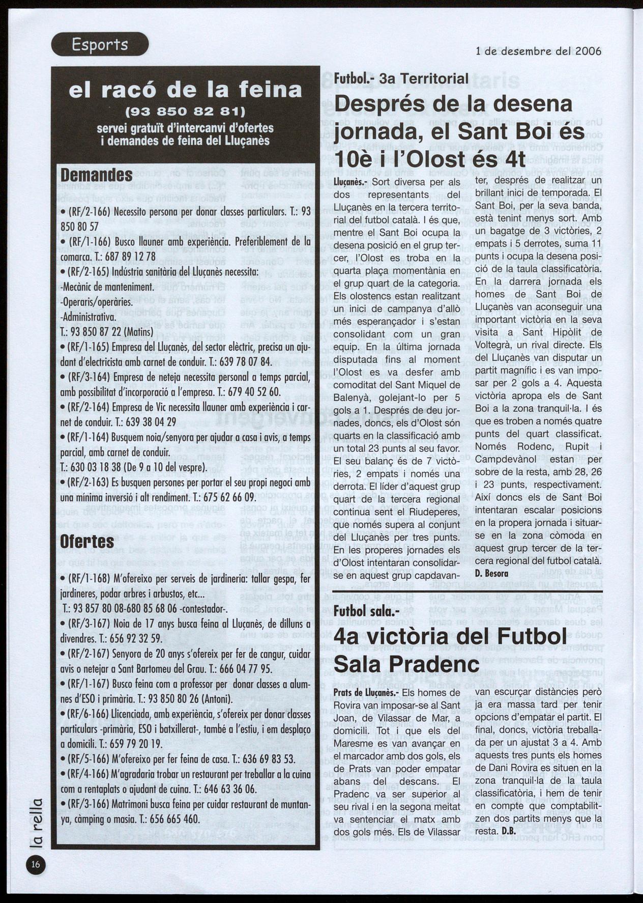 ter, després de realitzar un brillant inici de temporada. El Sant Boi, per la seva banda, està tenint menys sort. Amb un bagatge de 3 victòries, 2 empats 5 derrotes, suma 11 punts ocupa la desena posició de la taula classificatòria. En la darrera jornada els homes de Sant Boi de Lluçanès van aconseguir una important victòria en la seva visita a Sant Hipòlit de Voltegrà, un rival directe. Els del Lluçanès van disputar un partit magnífic es van imposar per 2 gols a 4. Aquesta victòria apropa els de Sant Boi a la zona tranquil-ta. és que es troben a només quatre punts del quart classificat. Només Rodenc, Rupit Campdevànol estan per sobre de la resta, amb 28, 26 i 23 punts, respectivament. Així doncs els de Sant Boi intentaran escalar posicions en la propera jornada situarse en la zona còmoda en aquest grup tercer de la tercera regional del futbol català. D. Besora