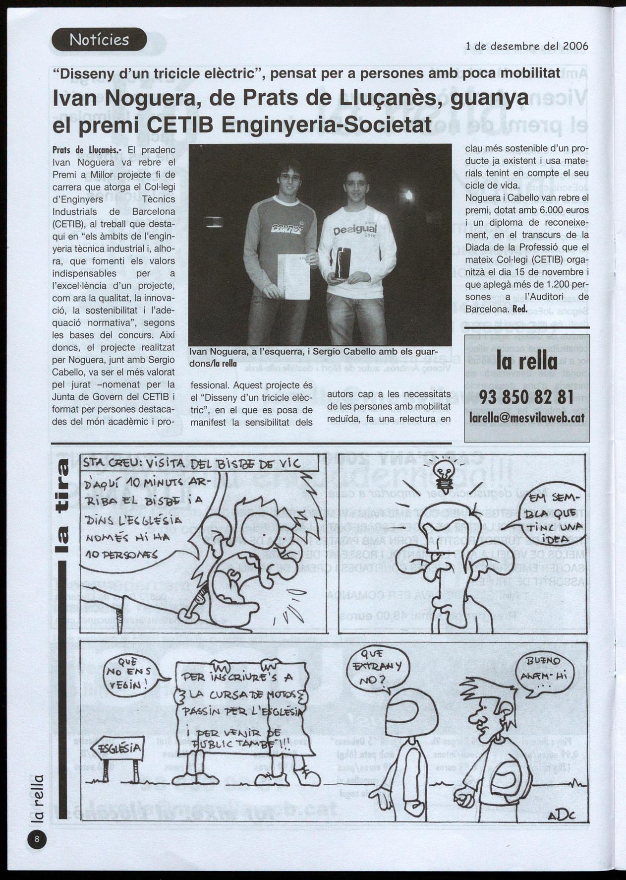 Prats de L1u�anès.- El pradenc Ivan Noguera va rebre el Premi a Millor projecte fi de carrera que atorga el Col·legi d'Enginyers Tècnics Industrials de Barcelona (CETIB), al treball que destaqui en "els àmbits de l'enginyeria tècnica industrial i, alhora, que fomenti els valors indispensables per a I'excel·lència d'un projecte, com ara la qualitat, la innovació, la sostenibilitat l'adequació normativa", segons les bases del concurs. Així doncs, el projecte realitzat per Noguera, junt amb Sergio Cabello, va ser el més valorat pel jurat -nomenat per la Junta de Govern del CETIB format per persones destacades del món acadèmic pro-