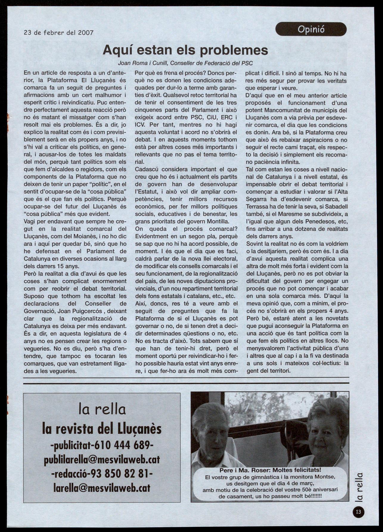 Així, doncs, res té a veure amb el seguit depreguntes que fa la Plataforma de si el Lluçanès es pot governar a no, de si tenen dret a decidir determinades qüestions a no, etc. No es tracta d'això. Tots sabem que sí que han de tenir-hi dret, però el moment oportú per reivindicar-ho i ferho possible hauria estat vint anys enrere, i que fer-ho ara és molt més com-