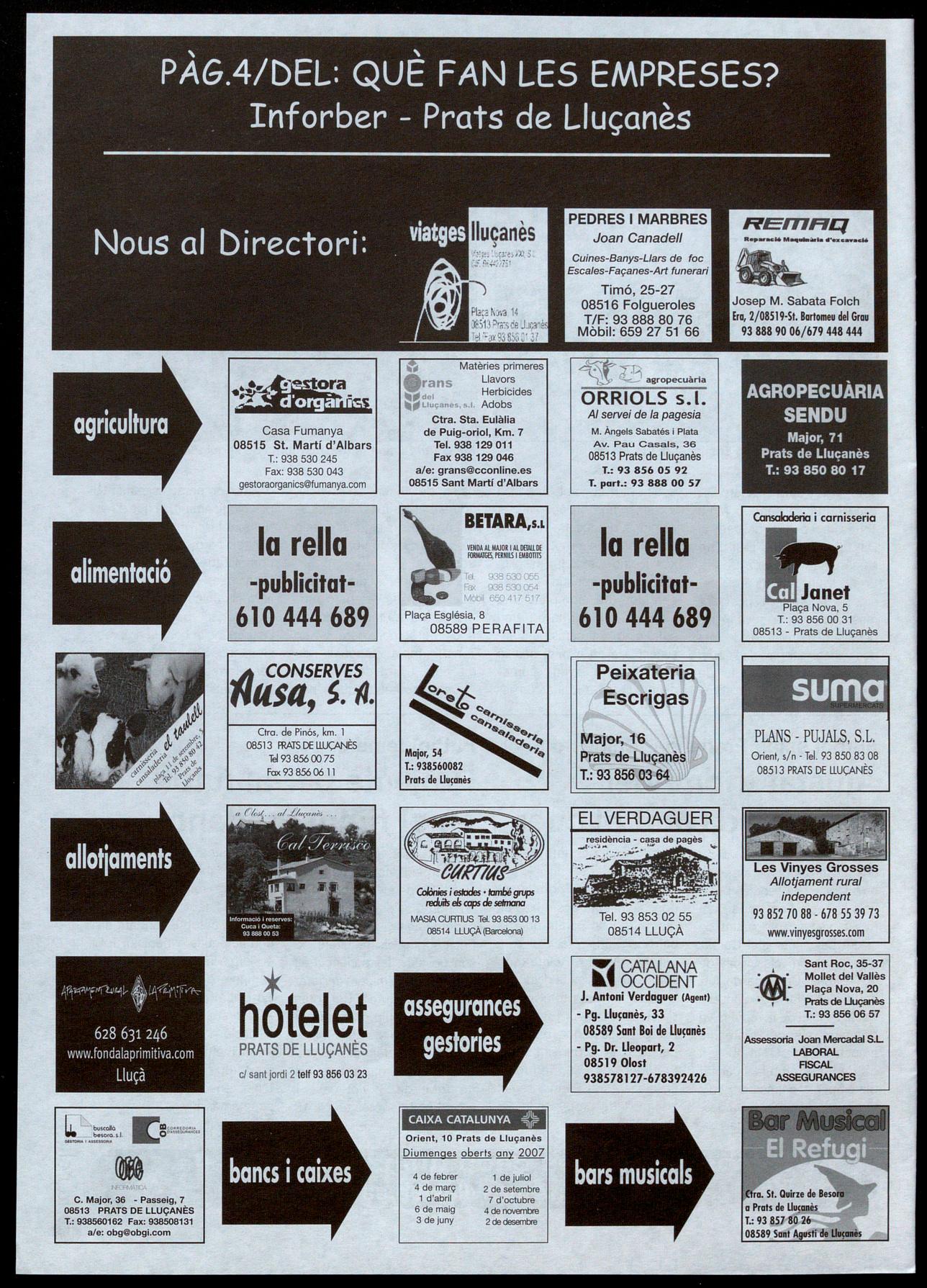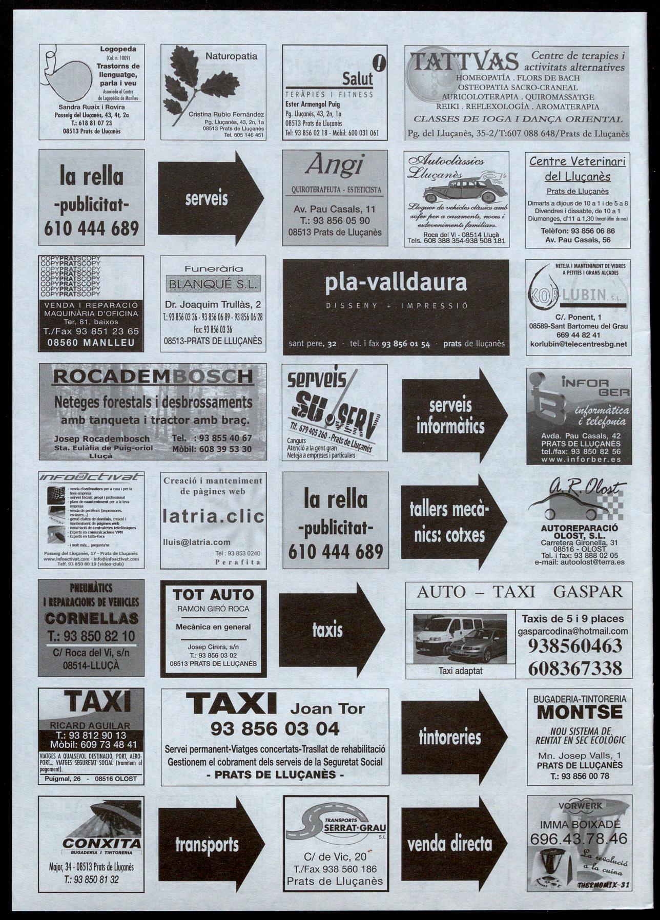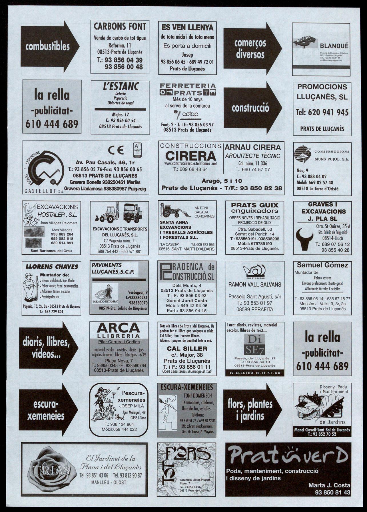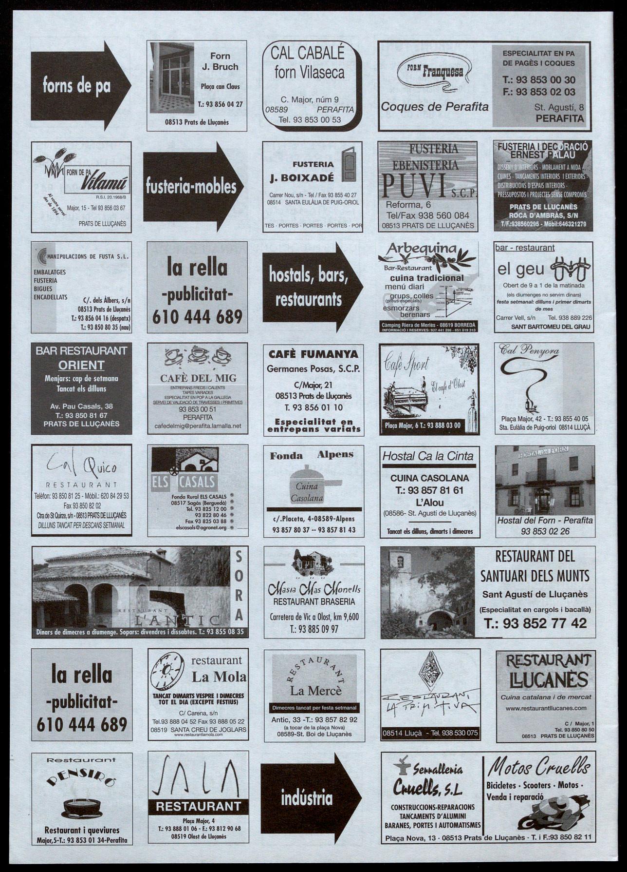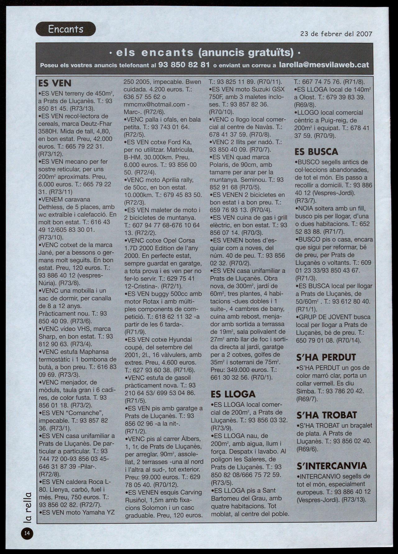 cial de 200m2, a Prats de S'HA TROBAT impecable. T.: 93 857 82 85602 96 -a la nit-. Lluçanès. T.: 93 856 03 32. -S'HA TROBAT un braçalet 36. (R73/1). (R71/2). (R73/9). de plata. A Prats de -ES VEN casa unifamiliar a -VENC pis al carrer Àlbers, -ES LLOGA nau, de Lluçanès. T.: 93 856 02 40. Prats de Lluçanès. De par- 1, 1 r, de Prats de Lluçanès, 200m2, amb aigua, llum (R69/6). ticular a particular. T.: 93 per arreglar. 90m2, assole- força. Despatx lavabo. AI 744 72 00-93 856 03 45lIat, 2 terrasses -una al nord polígon les Saleres, de S'INTERCANVIA 646 31 87 39 -Pilar-. i l'altra al sud-, tot exterior. Prats de Lluçanès. T.: 93 (R72/8). Preu: 99.000 euros. T.: 629 8508208/666757259. -INTERCANVIO segells de -ES VEN caldera Roca L- 78 05 40. (R70/12). (R73/5). tot el món, especialment 80. Llenya, carbó, fuel i -ES VENEN esquís Carving -ES LLOGA pis a Sant europeus. T.: 93 886 4012 Cl més. Preu, 750 euros. T.: Rusiñol, 1 ,5m amb fixa- Bartomeu del Grau, amb (Vespres-Jordi). (R73/13). � 93 856 02 82. (R72/7). cians Solomon i un casc quatre habitacions. Tot s; -ES VEN moto Yamaha YZ graduable. Preu, 120 euros. moblat, al centre del poble.