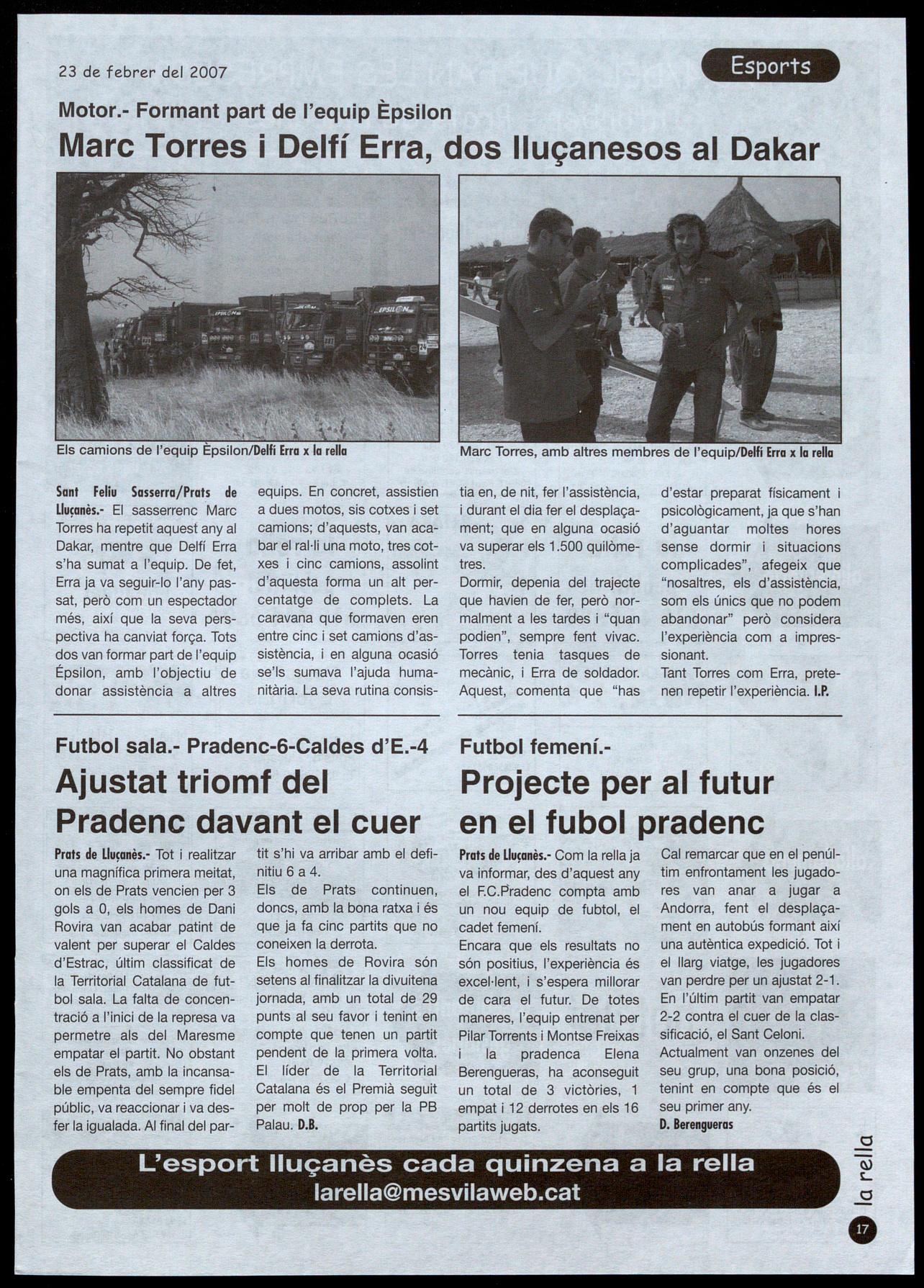 Sant Feliu Sasserra/Prats de Lluçanès.- El sasserrenc Marc Torres ha repetit aquest anyal Dakar, mentre que Delfí Erra s'ha sumat a l'equip. De fet, Erra ja va seguir-lo l'any passat, però com un espectador més, així que la seva perspectiva ha canviat força. Tots dos van formar part de l'equip Épsilon, amb l'objectiu de donar assistència a altres
