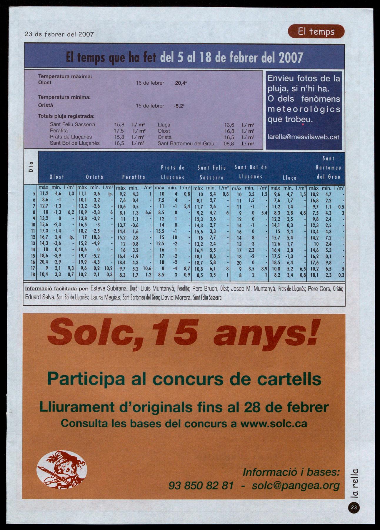 Informació facilitada per: Esteve Subirana, Uu¡à; Lluís Muntanyà, Perafita; Pere Bruch, Olost; Josep M. Muntanyà, Prats �e Uu¡anès; Pere Cors, Oristà; Eduard Selva, Sant Boi �e Uu¡anès; Laura Megias, SantBartomeu �el Grau; David Morera, Sant feliu Sasserra