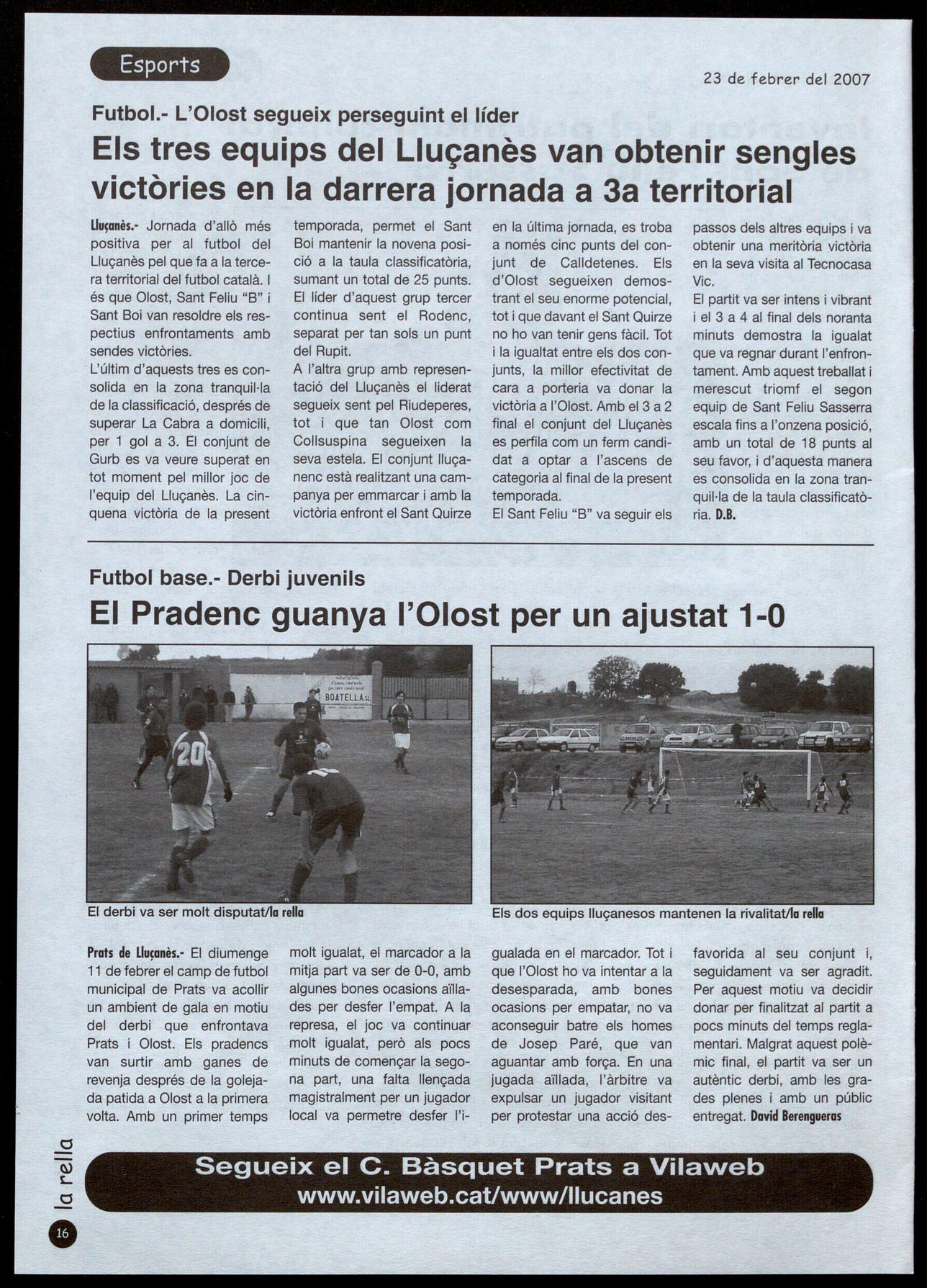 Prats de L1uçanès.- El diumenge 11 de febrer el camp de futbol municipal de Prats va acollir un ambient de gala en motiu del derbi que enfrontava: Prats Olost. Els pradencs van surtir amb ganes de revenja després de la golejada patida a Olost a la primera volta. Amb un primer temps