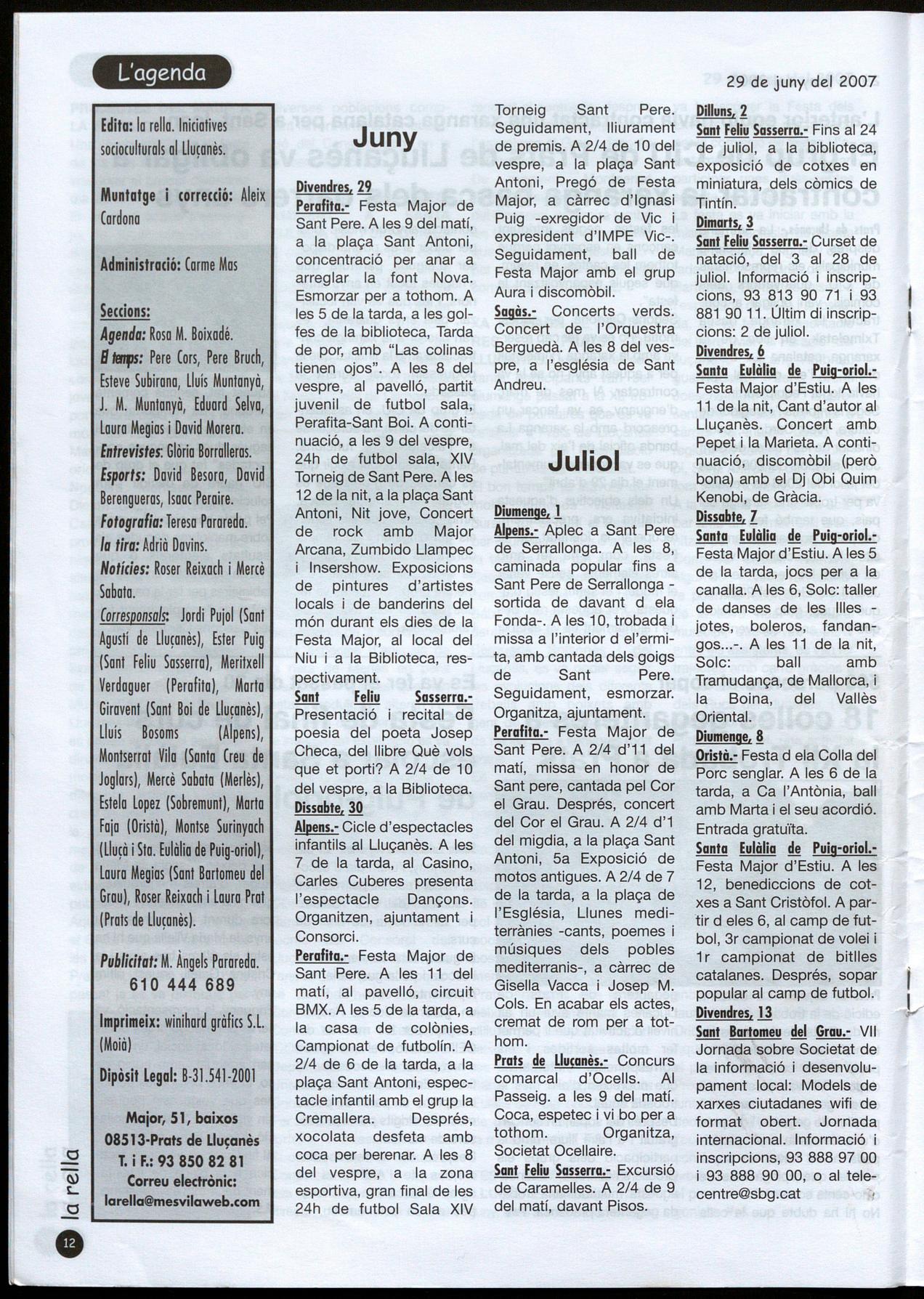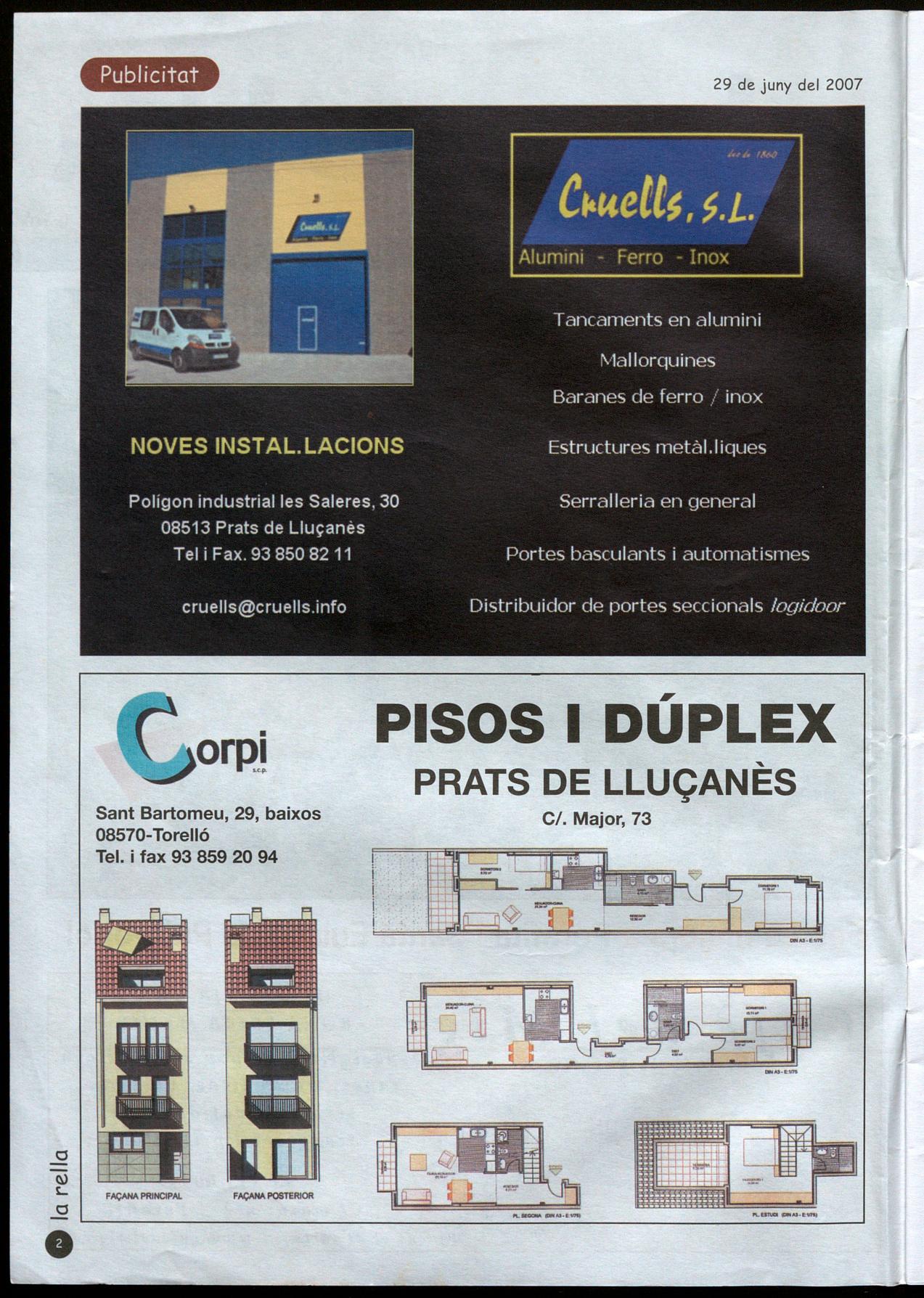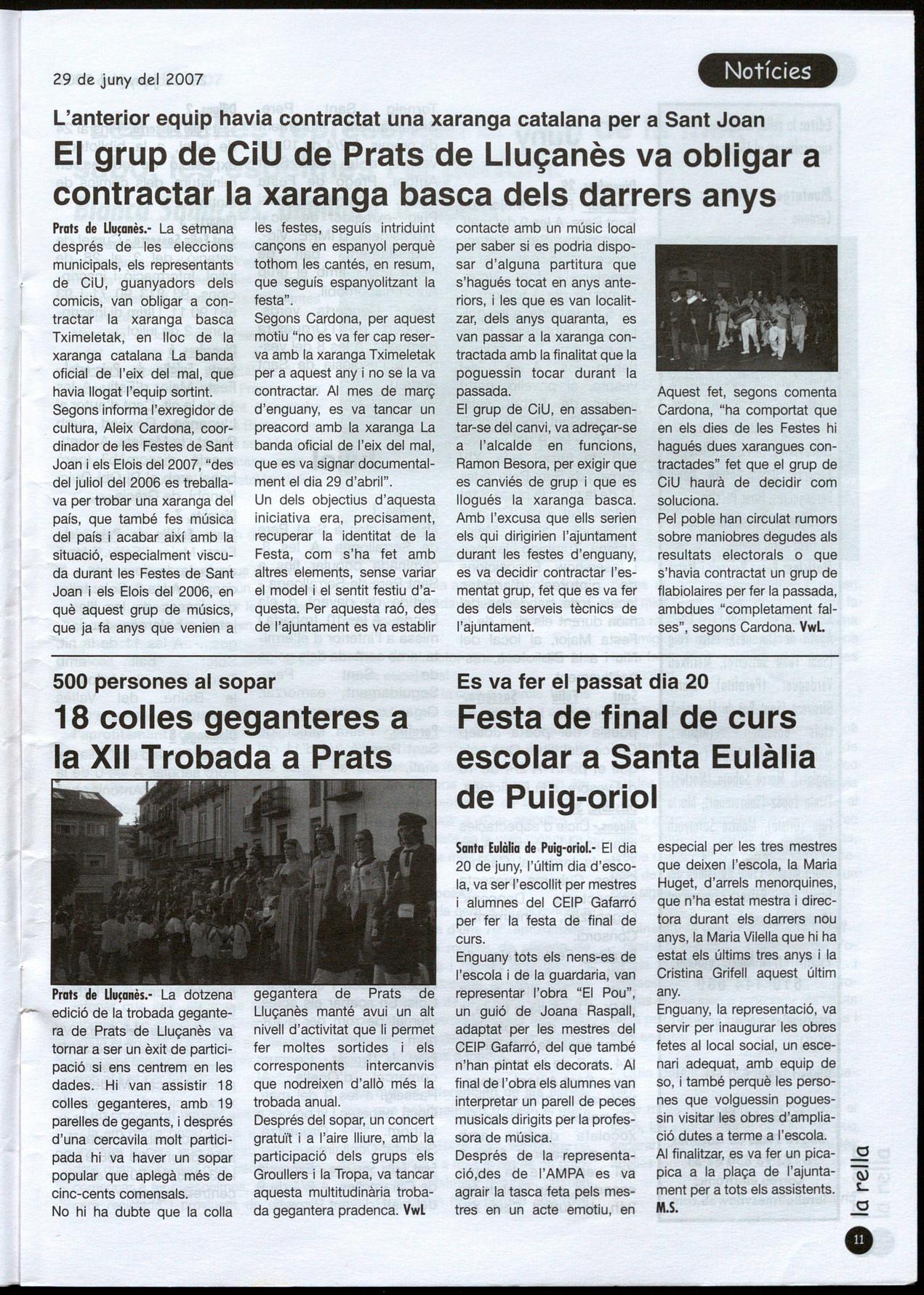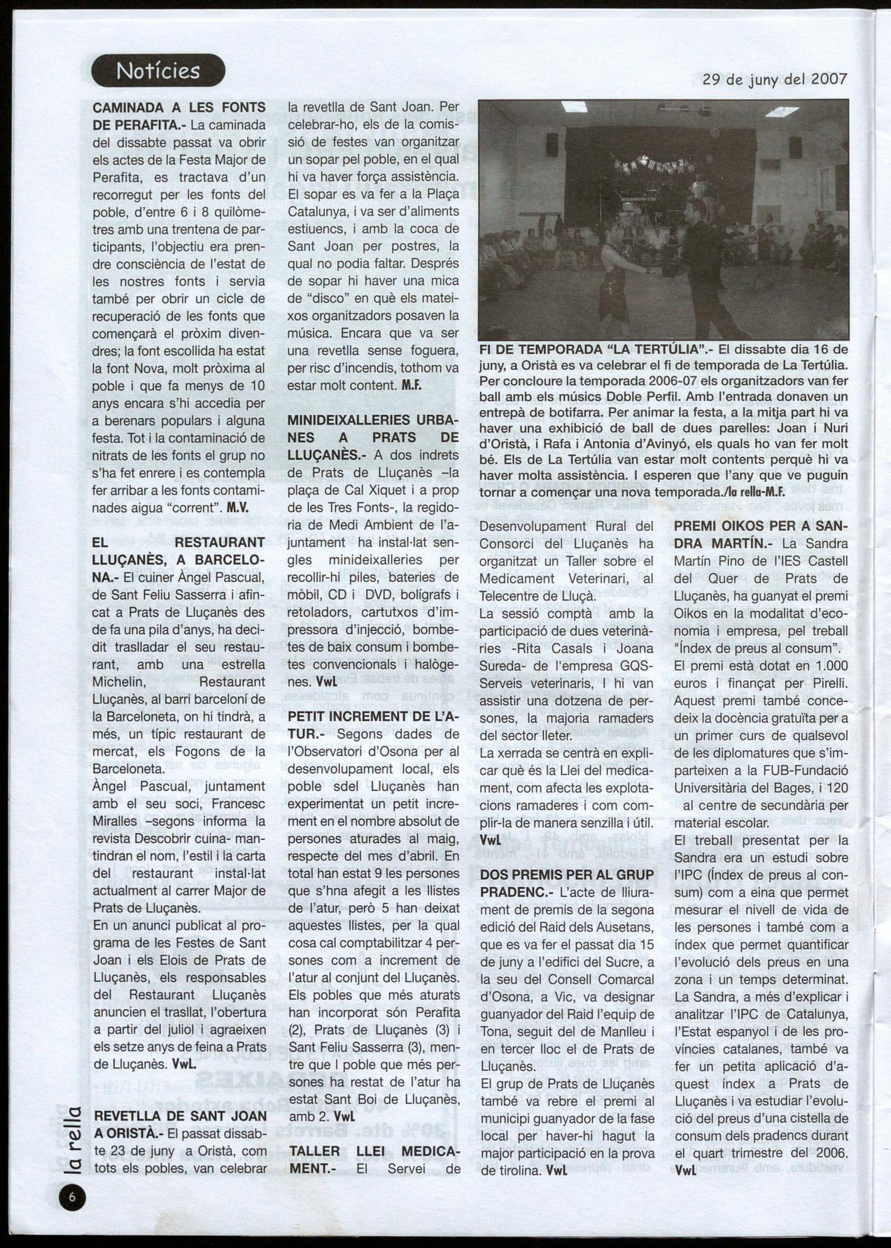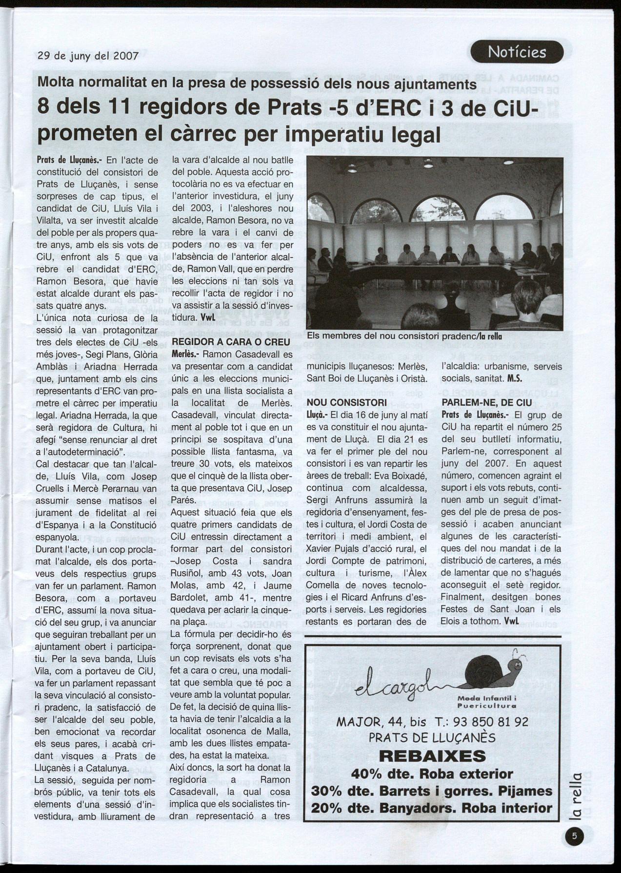 Prats de Llu�anès.- El grup de CiU ha repartit el número 25 del seu butlletí informatiu, Parlem-ne, corresponent al juny del 2007. En aquest número, comencen agraint el suport els vots rebuts, continuen amb un seguit d'imatges del ple de presa de possessió acaben anunciant algunes de les característiques del nou mandat i de la distribució de carteres, a més de lamentar que no s'hagués aconseguit el setè regidor. Finalment, desitgen bones Festes de Sant Joan els Elois a tothom. VwL