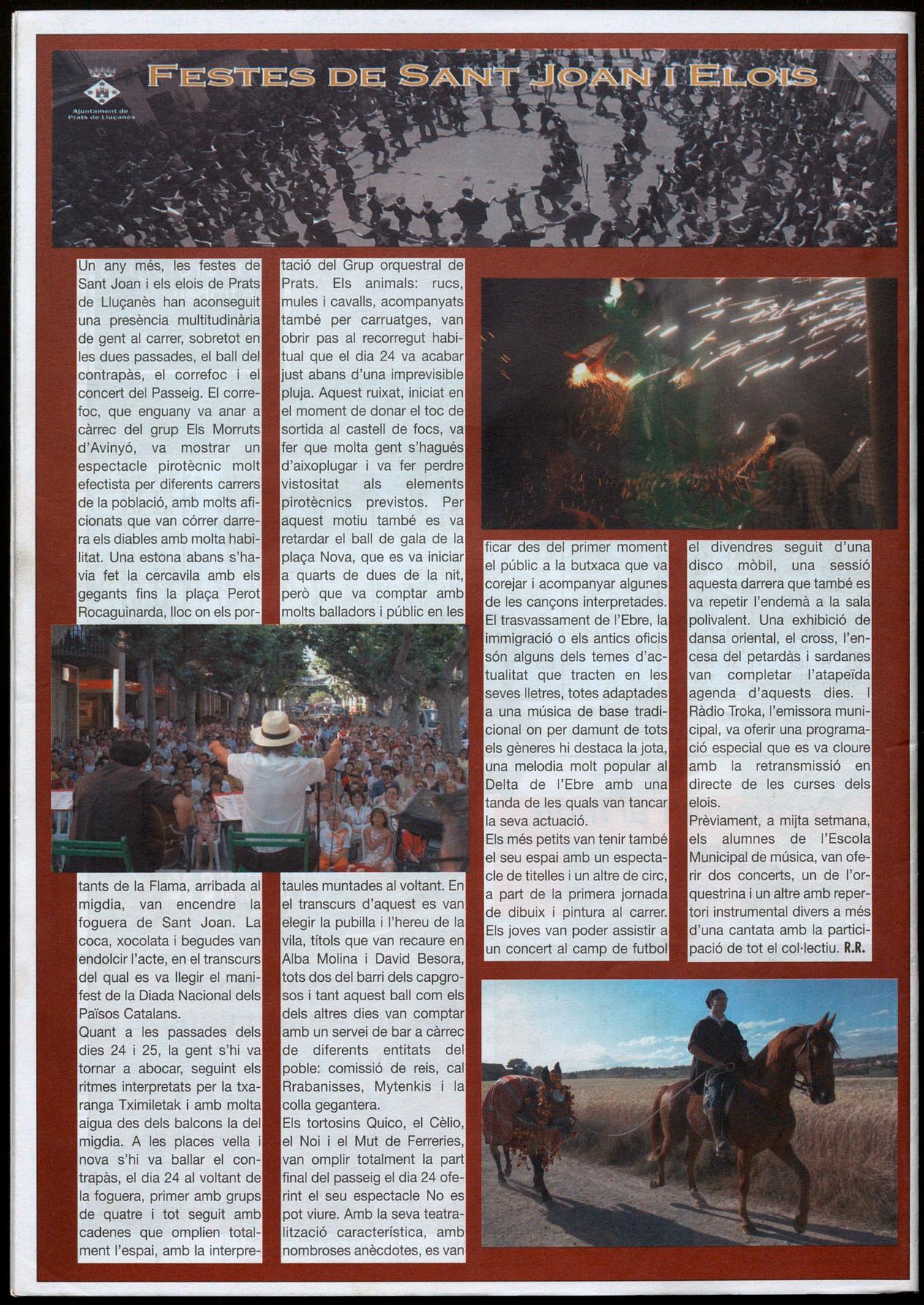Un any més, les festes de Sant Joan els elois de Prats de Lluçanès han aconseguit una presència multitudinària de gent al carrer, sobretot en les dues passades, el ball del contrapàs, el correfoc el concert del Passeig. El correfoc, que enguany va anar a càrrec del grup Els Morruts d'Avinyó, va mostrar un espectacle pirotècnic molt efectista per diferents carrers de la població, amb molts aficionats que van córrer darrera els diables amb molta habi-