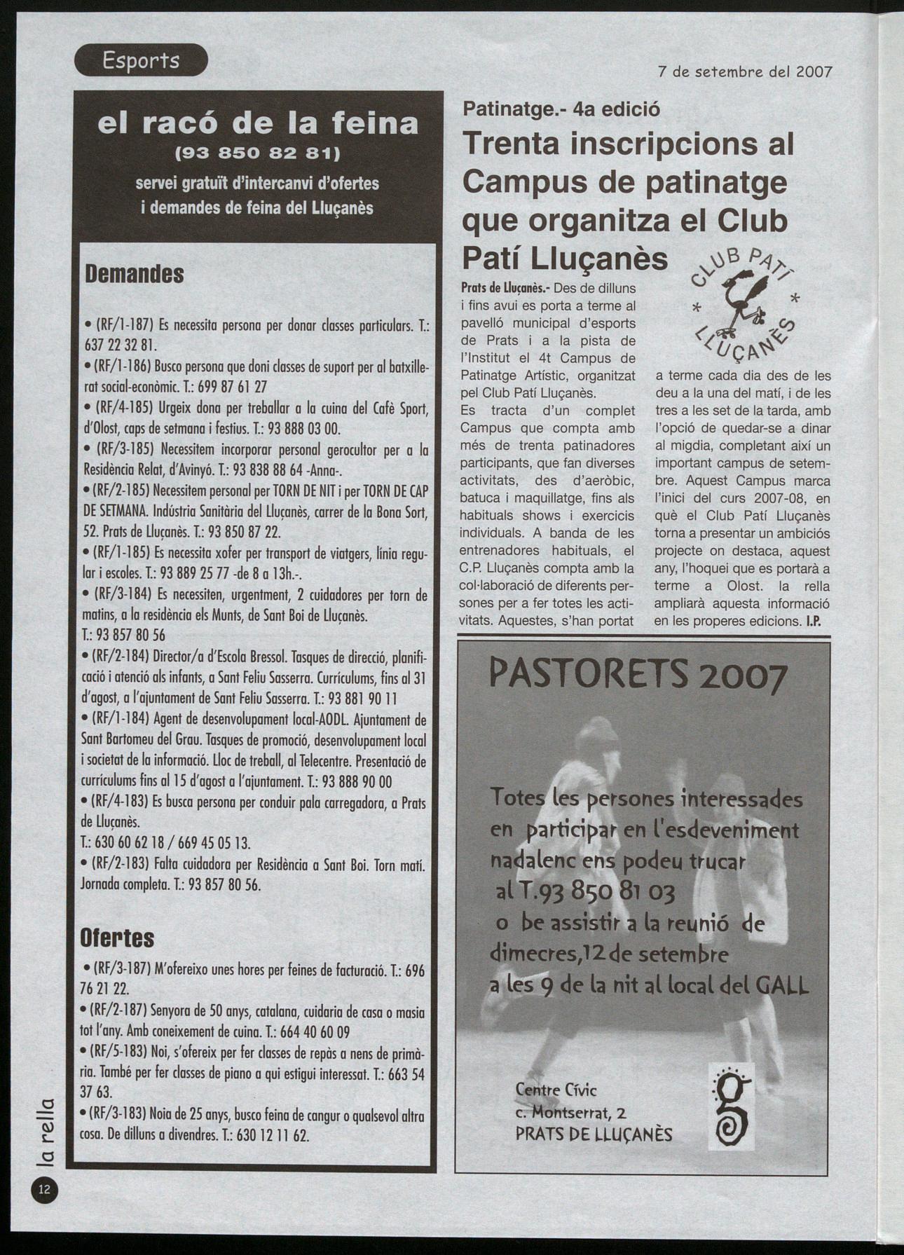 a terme cada dia des de les deu a la una del matí, de les tres a les set de la tarda, amb l'opció de quedar-se a dinar al migdia, completant així un important campus de setembre. Aquest Campus marca l'inici del curs 2007-08, en què el Club Patí Lluçanès torna a presentar un ambiciós projecte on destaca, aquest any, l'hoquei que es portarà a terme a Olost. la rella ampliarà aquesta informació en les properes edicions. I.P.