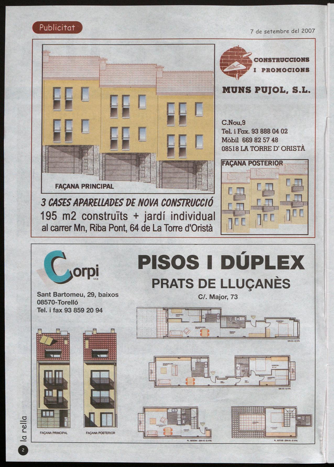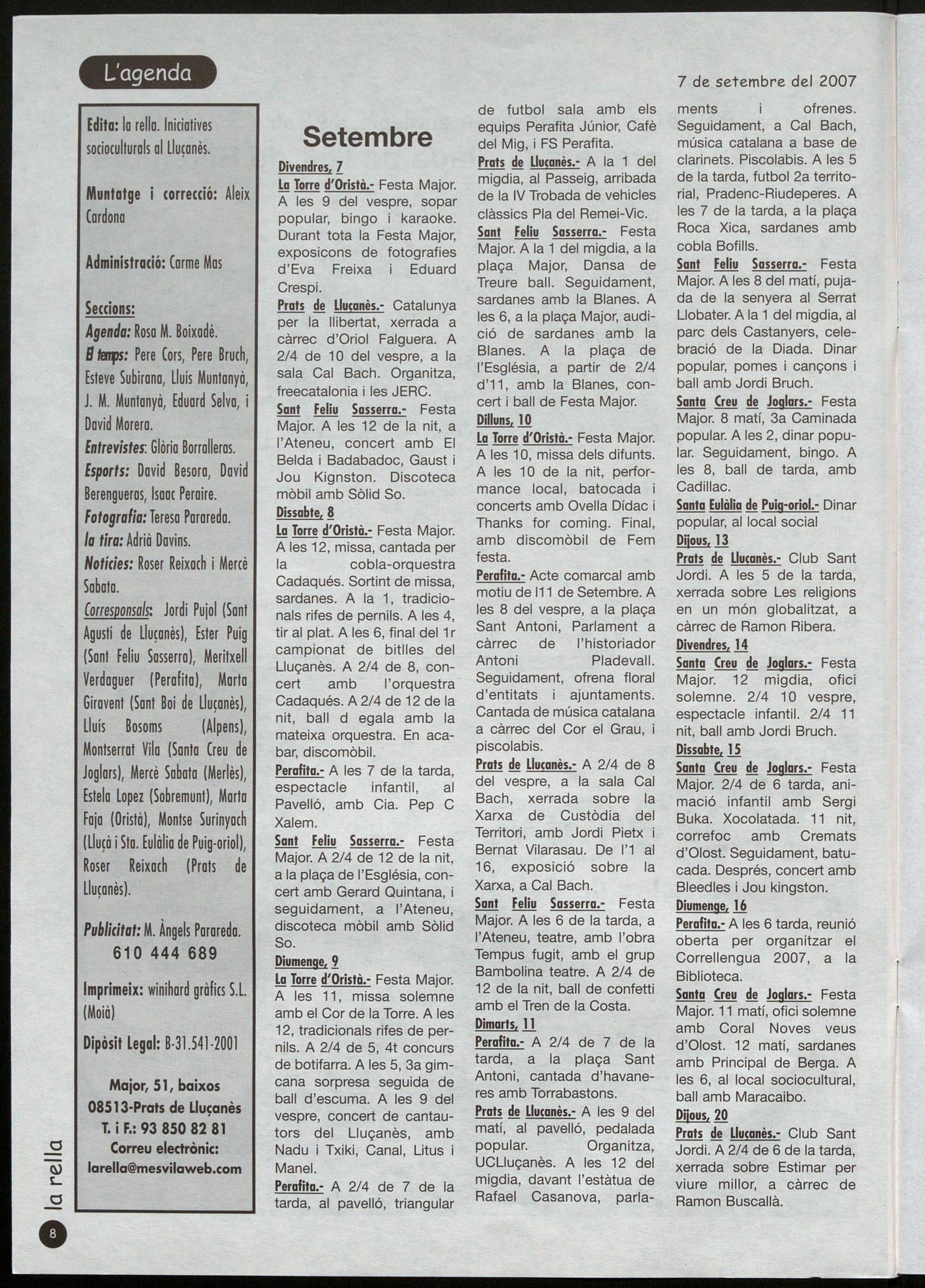 • del 6 a 1"11 de setembre Festa Major 2007 ball a càrrec del pradenc Jordi Bruch. En l'apartat d'actes religiosos, el dia 10 es farà la bene-