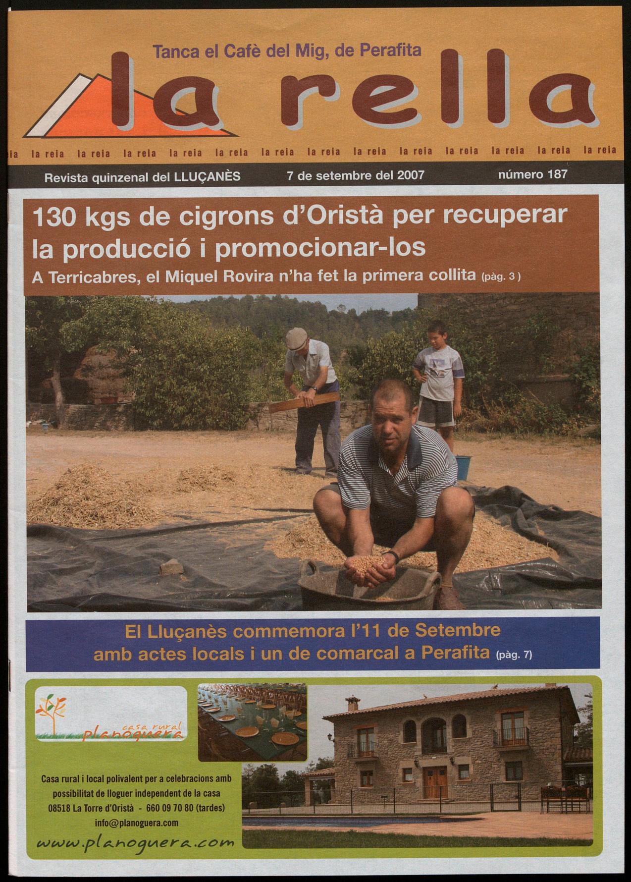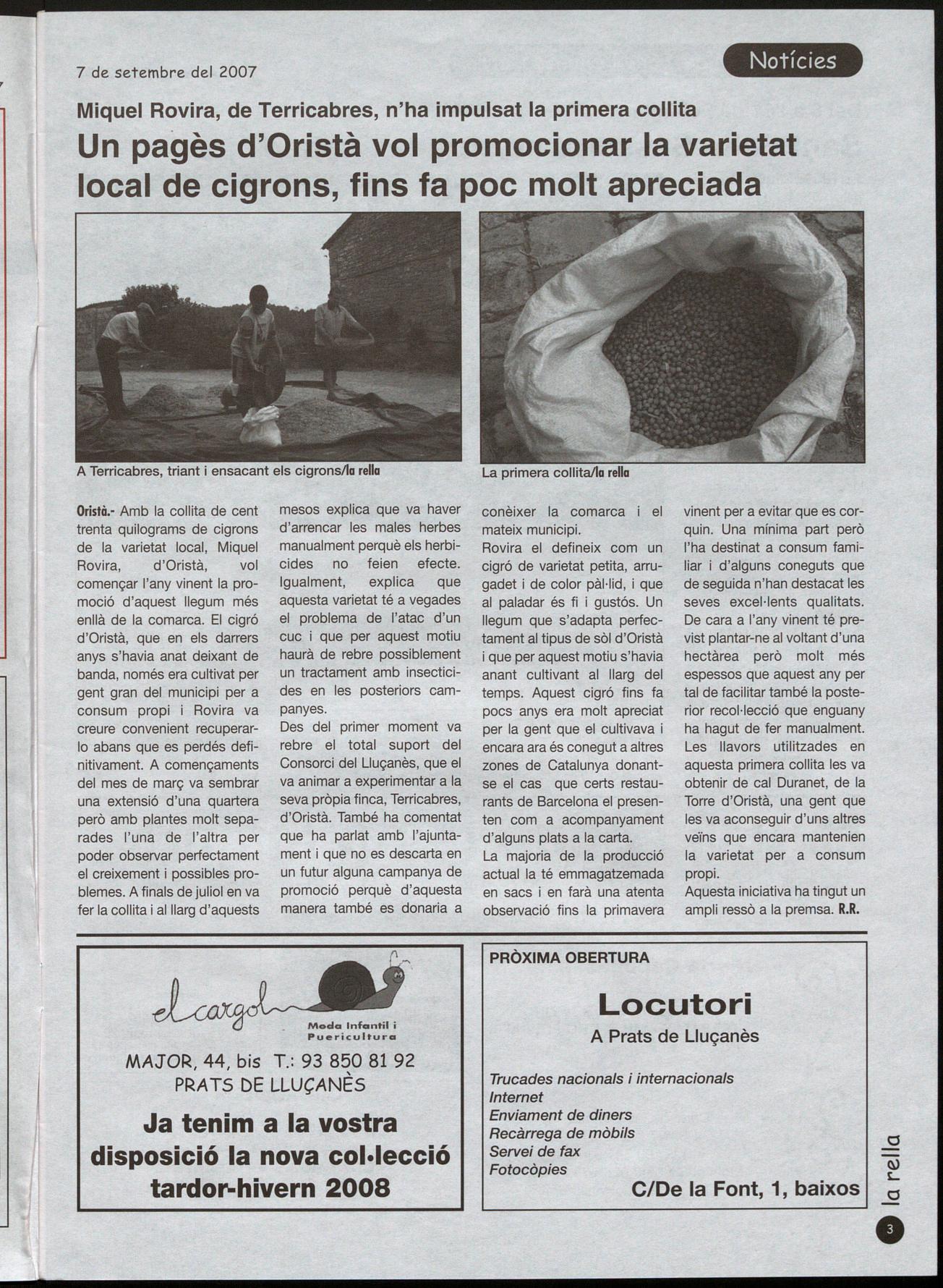 Oristà.- Amb la collita de cent trenta quilograms de cigrons de la varietat local, Miquel Rovira, d'Oristà, vol començar l'any vinent la promoció d'aquest llegum més enllà de la comarca. El cigró d'Oristà, que en els darrers anys s'havia anat deixant de banda, només era cultivat per gent gran del municipi per a consum propi i Rovira va creure convenient recuperarlo abans que es perdés definitivament. A començaments del mes de març va sembrar una extensió d'una quartera però amb plantes molt separades l'una de l'altra per poder observar perfectament el creixement i possibles problemes. A finals de juliol en va fer la collita aillarg d'aquests