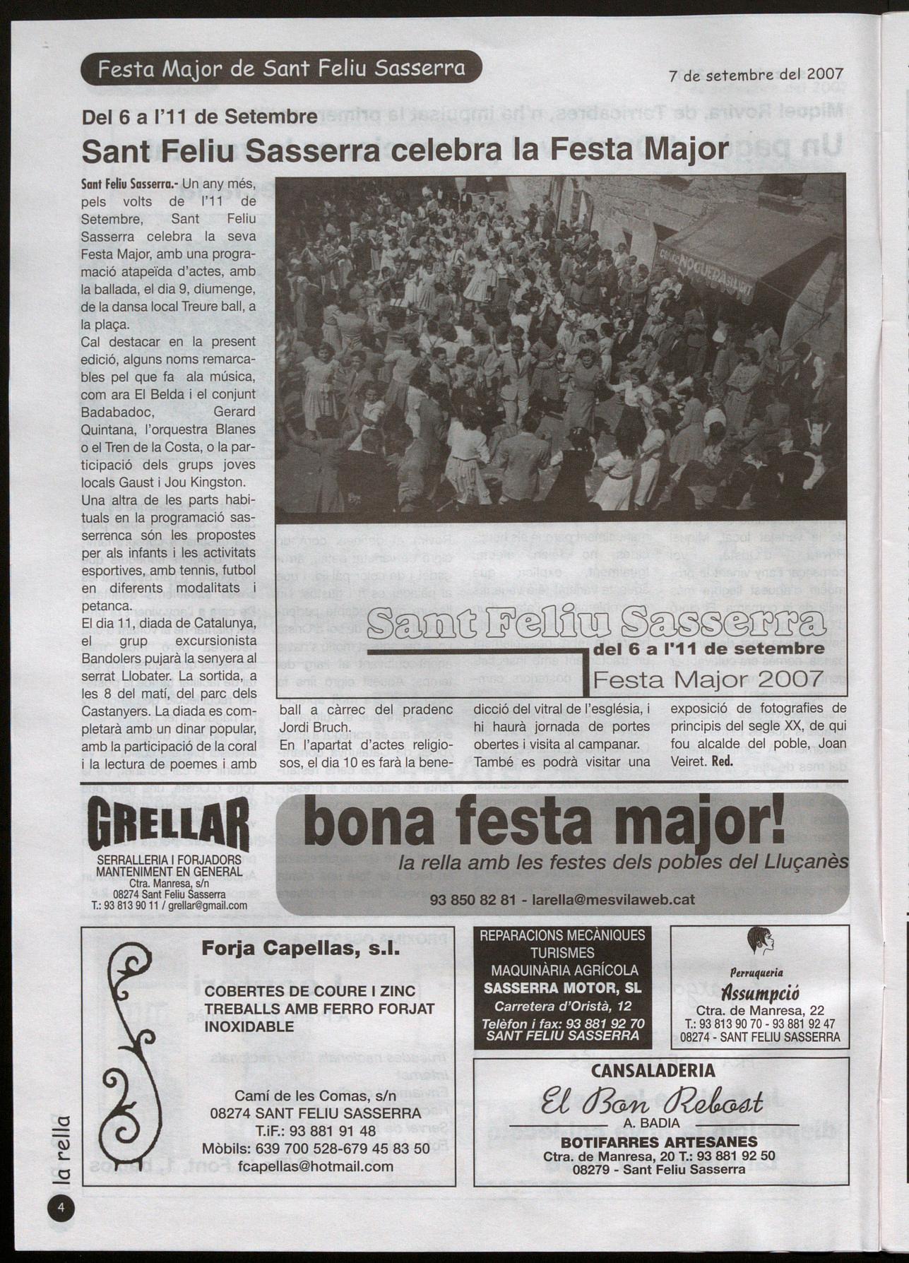 Sant Feliu Sasserra.- Un any més, pels volts de I'll de Setembre, Sant Feliu Sasserra celebra la seva Festa Major, amb una programació atapeïda d'actes, amb la ballada, el dia 9, diumenge, de la dansa local Treure ball, a la plaça.
