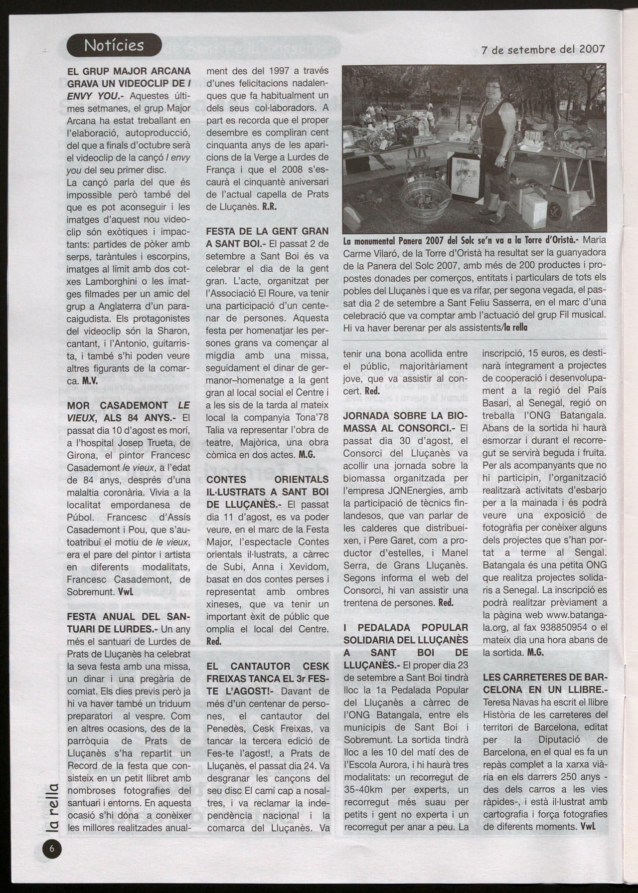 La monumental Panera 2007 del Solc se'n va a la Torre d'Oristà.- Maria Carme Vilaró, de la Torre d'Oristà ha resultat ser la guanyadora de la Panera del Solc 2007, amb més de 200 productes propostes donades per comerços, entitats particulars de tots els pobles del Lluçanès que es va rifar, per segona vegada, el passat dia 2 de setembre a Sant Feliu Sasserra, en el marc d'una celebració que va comptar amb l'actuació del grup Fil musical. Hi va haver berenar per als assistentslla rella