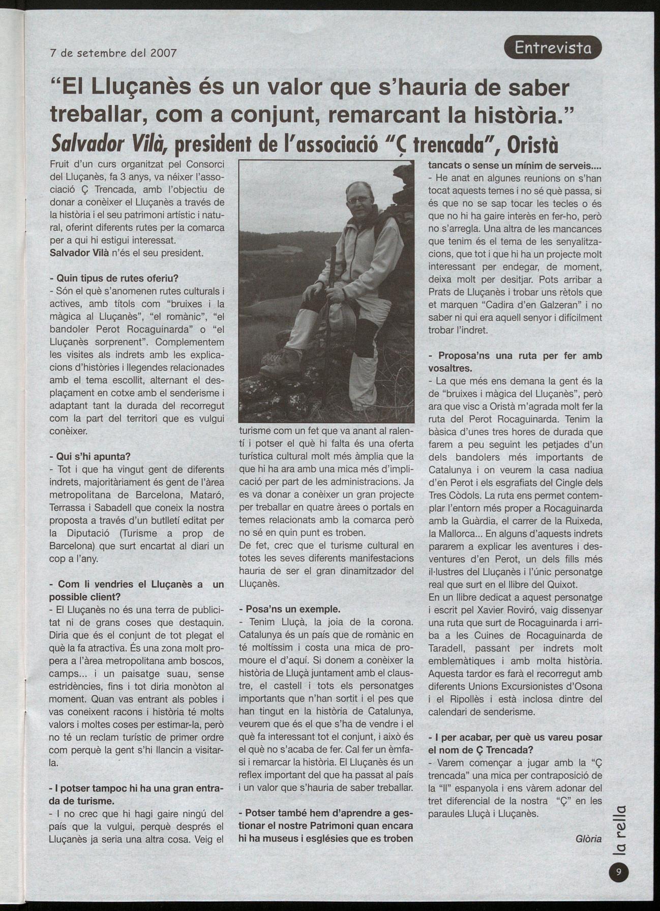 Llu�anès.- L'exposició "Un acord entre persones per tenir cura de la terra" de la xct es podrà veure al Lluçanès, entre els dies 1 de setembre 14 d'octubre, als pobles de Prats de Lluçanès, fins al dia 16, Sant Feliu Sasserra, fins al 30, Olost, del2 al14 d'octubre. El dia 10 de setembre, Jordi Pietx, de la Xarxa, Bernat Vilarasau, del