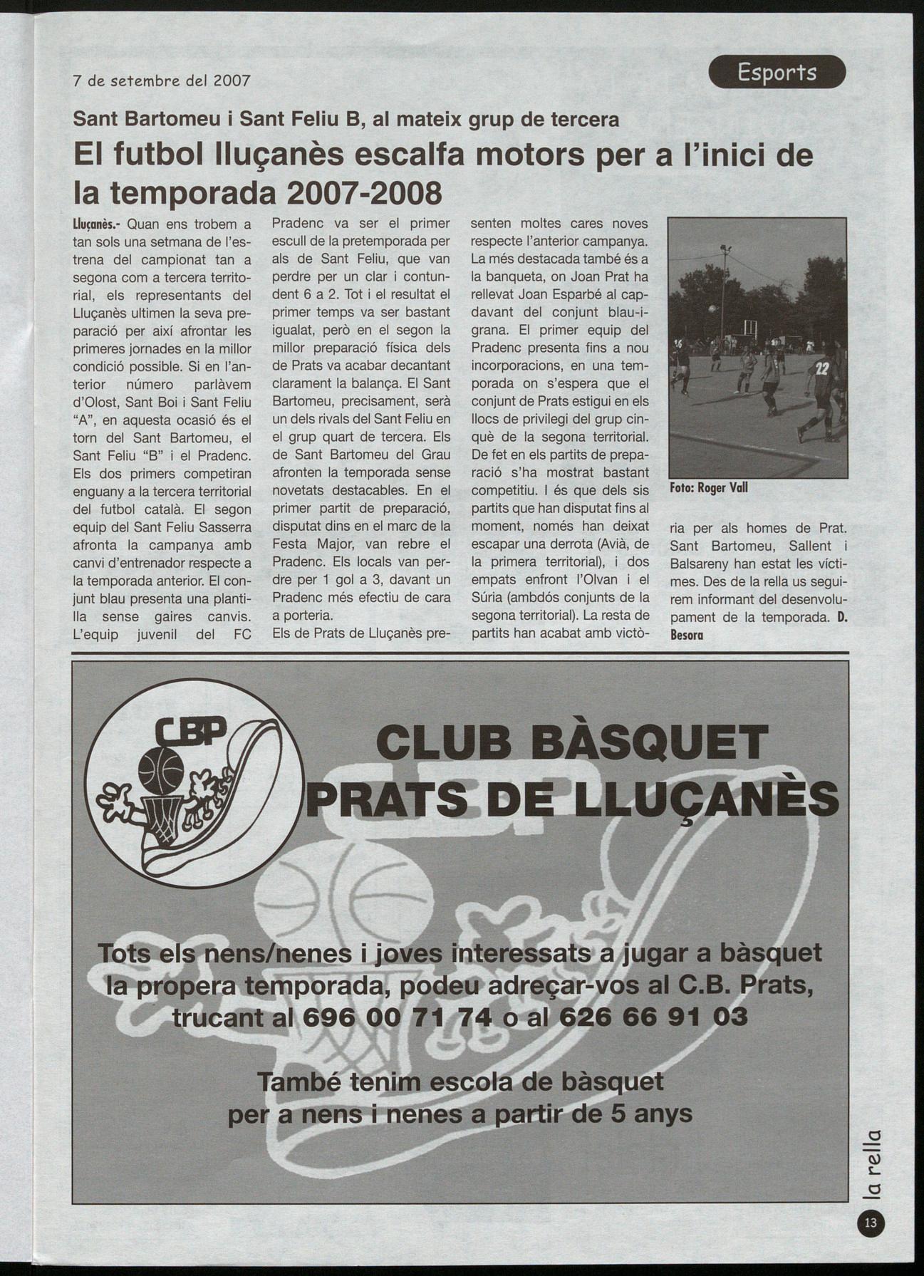 L1u�anès.- Quan ens trobem a tan sols una setmana de l'estrena del campionat tan a segona com a tercera territorial, els representants del Lluçanès ultimen la seva preparació per així afrontar les primeres jornades en la millor condició possible. Si en l'anterior número parlàvem d'Olost, Sant Boi Sant Feliu "A", en aquesta ocasió és el torn del Sant Bartomeu, el Sant Feliu "B" el Pradenc. Els dos primers competiran enguany a la tercera territorial del futbol català. El segon equip del Sant Feliu Sasserra afronta la campanya amb canvi d'entrenador respecte a la temporada anterior. El conjunt blau presenta una plantilla sense gaires canvis. L'equip juvenil del FC