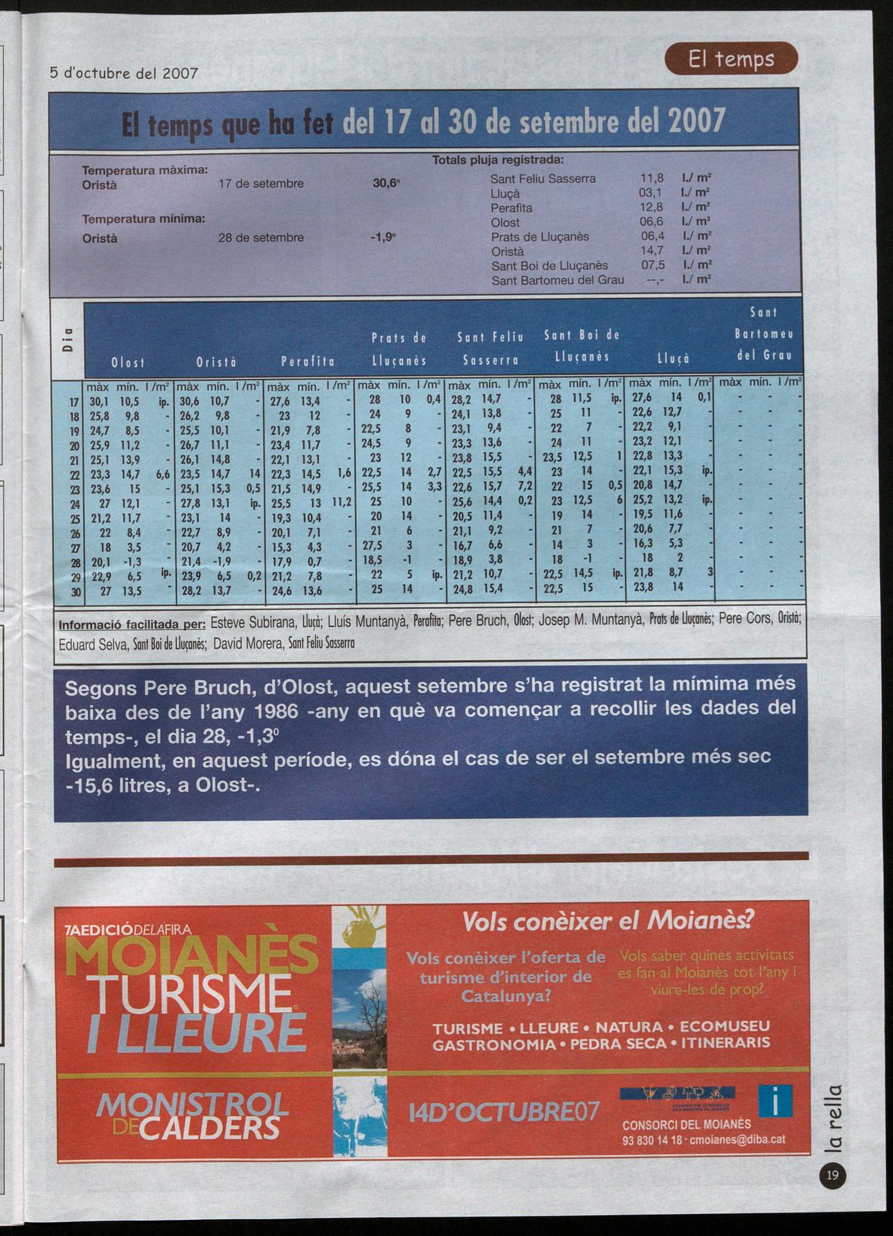 Segons Pere Bruch, d'Olost, aquest setembre s'ha registrat la mímima més baixa des de l'any 1986 -any en què va començar a recollir les dades del temps-, el dia 28, -1,3° Igualment, en aquest període, es dóna el cas de ser el setembre més sec -15,6 litres, a Olost-.