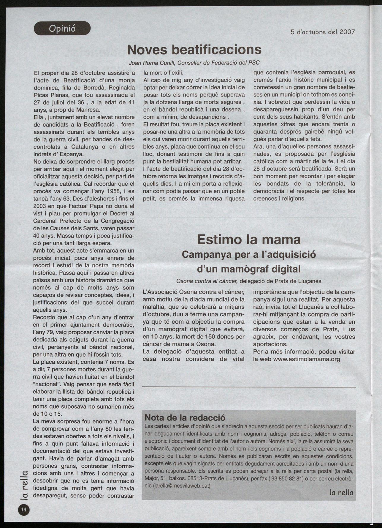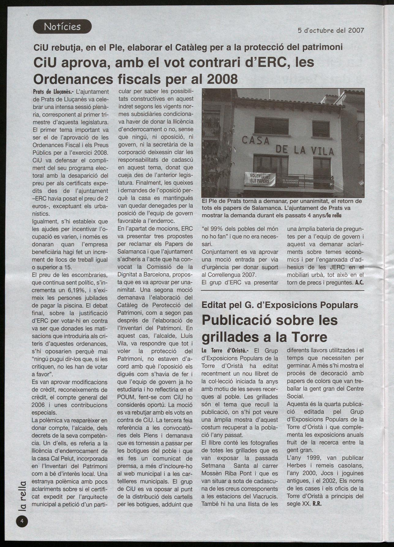 cular per saber les possibilitats constructives en aquest indret segons les vigents normes subsidiàries condicionava haver de donar la llicència d'enderrocament o no, sense que ningú, ni oposició, ni govern, ni la secretària de la corporació deixessin clar les responsabilitats de cadascú en aquest tema, donat que cueja des de l'anterior legislatura. Finalment, les queixes i demandes de l'oposició perquè la casa es mantingués van quedar denegades per la posició de l'equip de govern favorable a l'enderroc. En l'apartat de mocions, ERC va presentar tres propostes per reclamar els Papers de Salamanca i que l'ajuntament s'adherís a l'acte que ha convocat la Comissió de la Dignitat a Barcelona, proposta que es va aprovar per unanimitat. Una segona moció demanava l'elaboració del Catàleg de Perotecció del Patrimoni, com a segon pas després de l'elaboració de l'Inventari del Patrimoni. En aquest cas, l'alcalde, Lluís Vila, va respondre que tot voler la protecció del Patrimoni, no estaven d'acord amb què l'oposició els digués com s'havia de fer que l'equip de govern ja ho estudiaria i ho reflectiria en el POUM, fent-se com CiU ho considerés oportú. La moció es va rebutjar amb els vots en contra de CiU. La tercera feia referència a les convocatòries dels Plens demanava que es tornessin a passar per les botigues del poble que es fes un comunicat de premsa, a més d'incloure-ho al web municipal i a les carteilieres municipals. El grup de CiU es va oposar al punt de la distribució dels cartells per les botigues, adduint que