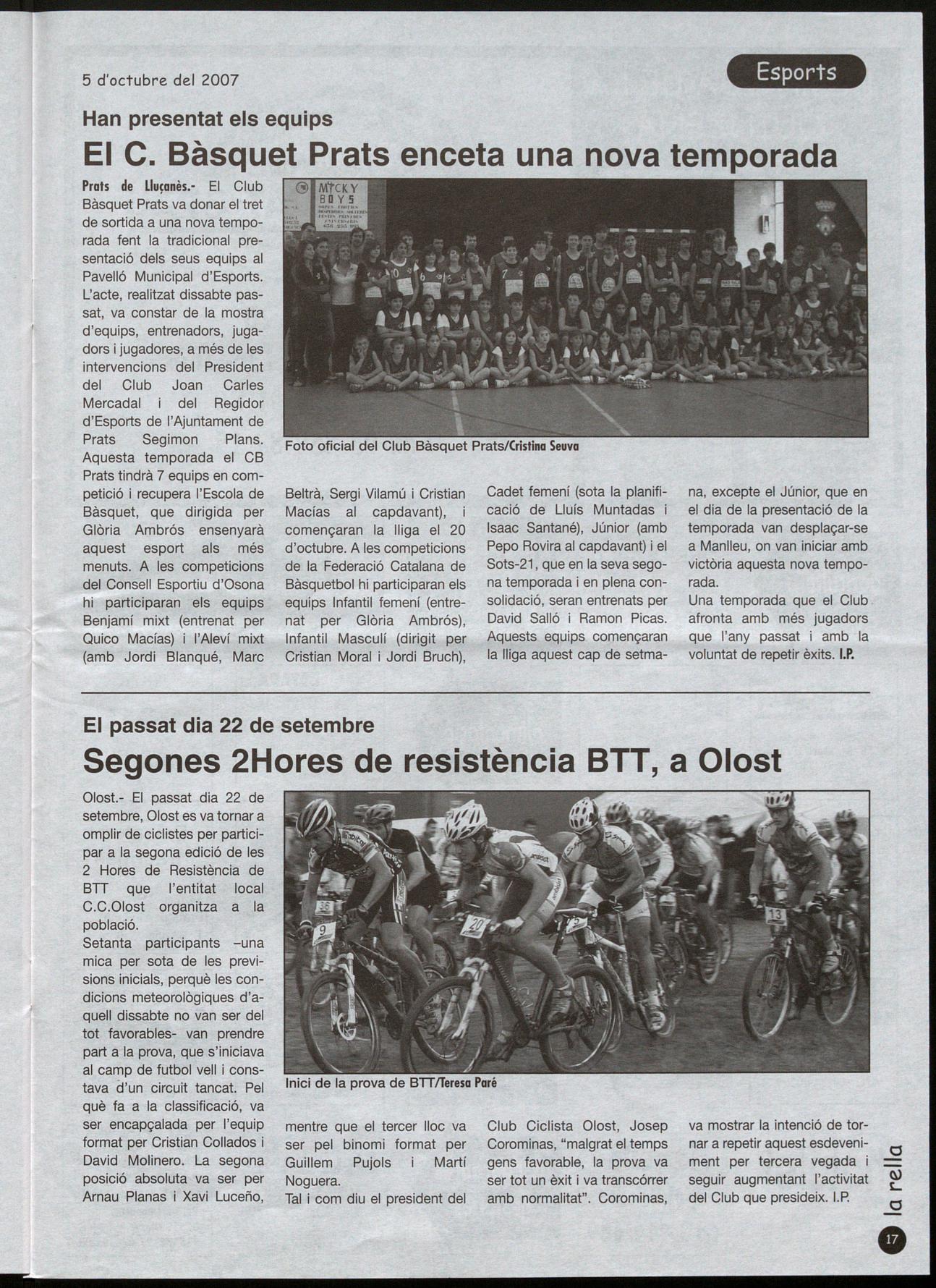 Olost- El passat dia 22 de setembre, Olost es va tornar a omplir de ciclistes per partielpar a la segona edició de les 2 Hores de Resistència de BTf que l'entitat local C.C.Olost organitza a la població.