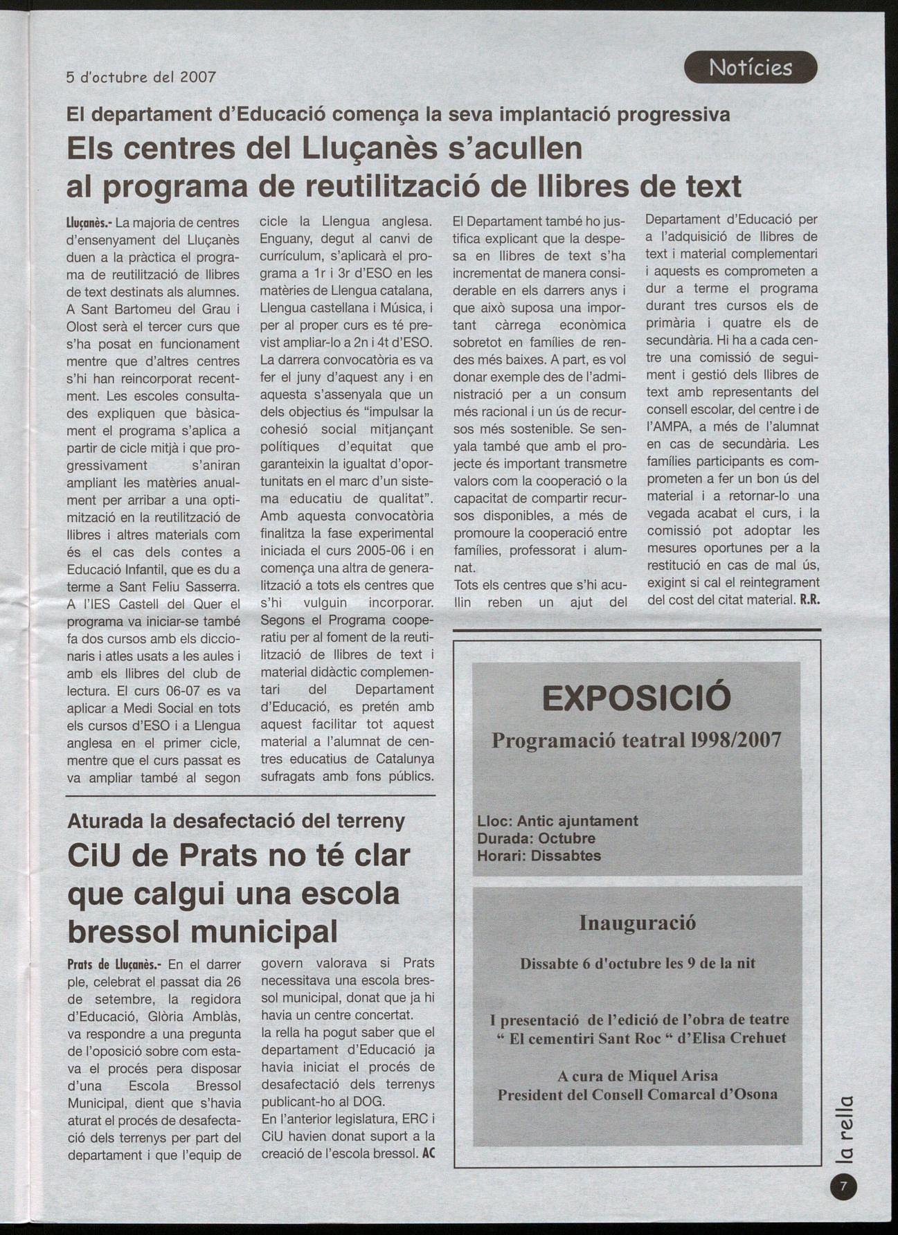 Lluçanès.- La majoria de centres d'ensenyament del Lluçanès duen a la pràctica el programa de reutilització de llibres de text destinats als alumnes. A Sant Bartomeu del Grau Olost serà el tercer curs que s'ha posat en funcionament mentre que d'altres centres s'hi han reincorporat recentment. Les escoles consultades expliquen que bàsicament el programa s'aplica a partir de cicle mitjà que progressivament s'aniran ampliant les matèries anualment per arribar a una optimització en la reutilització de llibres altres materials com és el cas dels contes a Educació Infantil, que es du a terme a Sant Feliu Sasserra. A l'lES Castell del Quer el programa va iniciar-se també fa dos cursos amb els diccionaris atles usats a les aules amb els llibres del club de lectura. El curs 06-07 es va aplicar a Medi Social en tots els cursos d'ESO a Llengua anglesa en el primer cicle, mentre que el curs passat es va ampliar també al segon