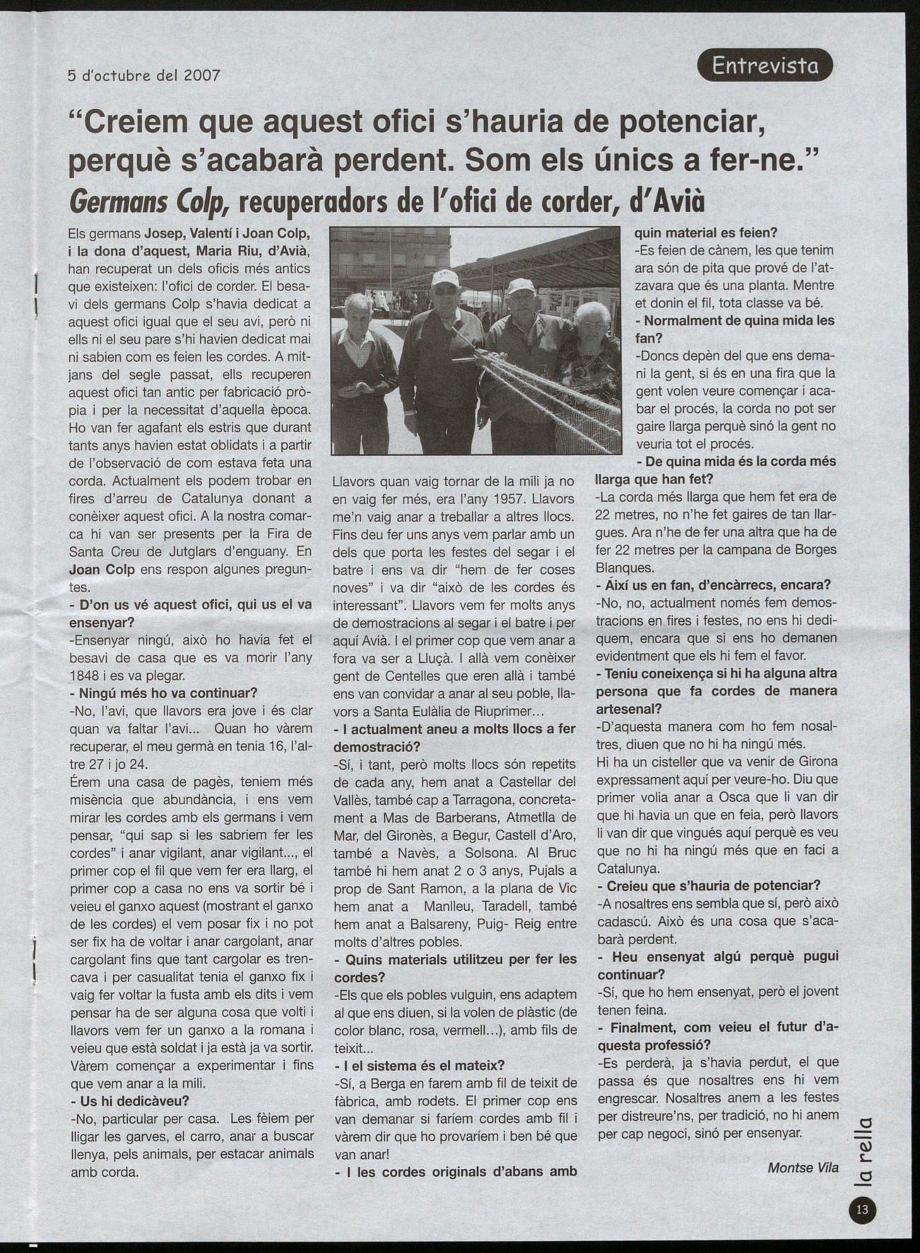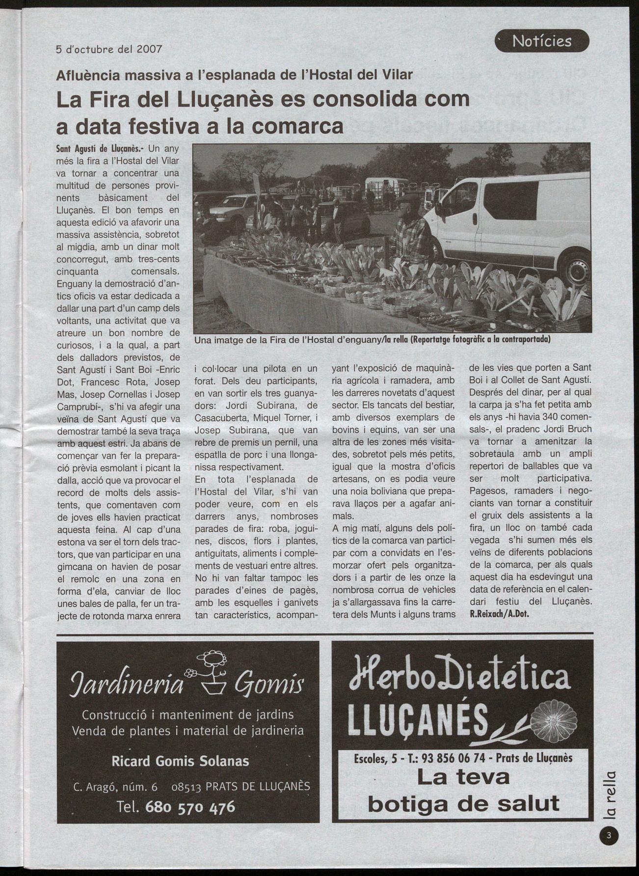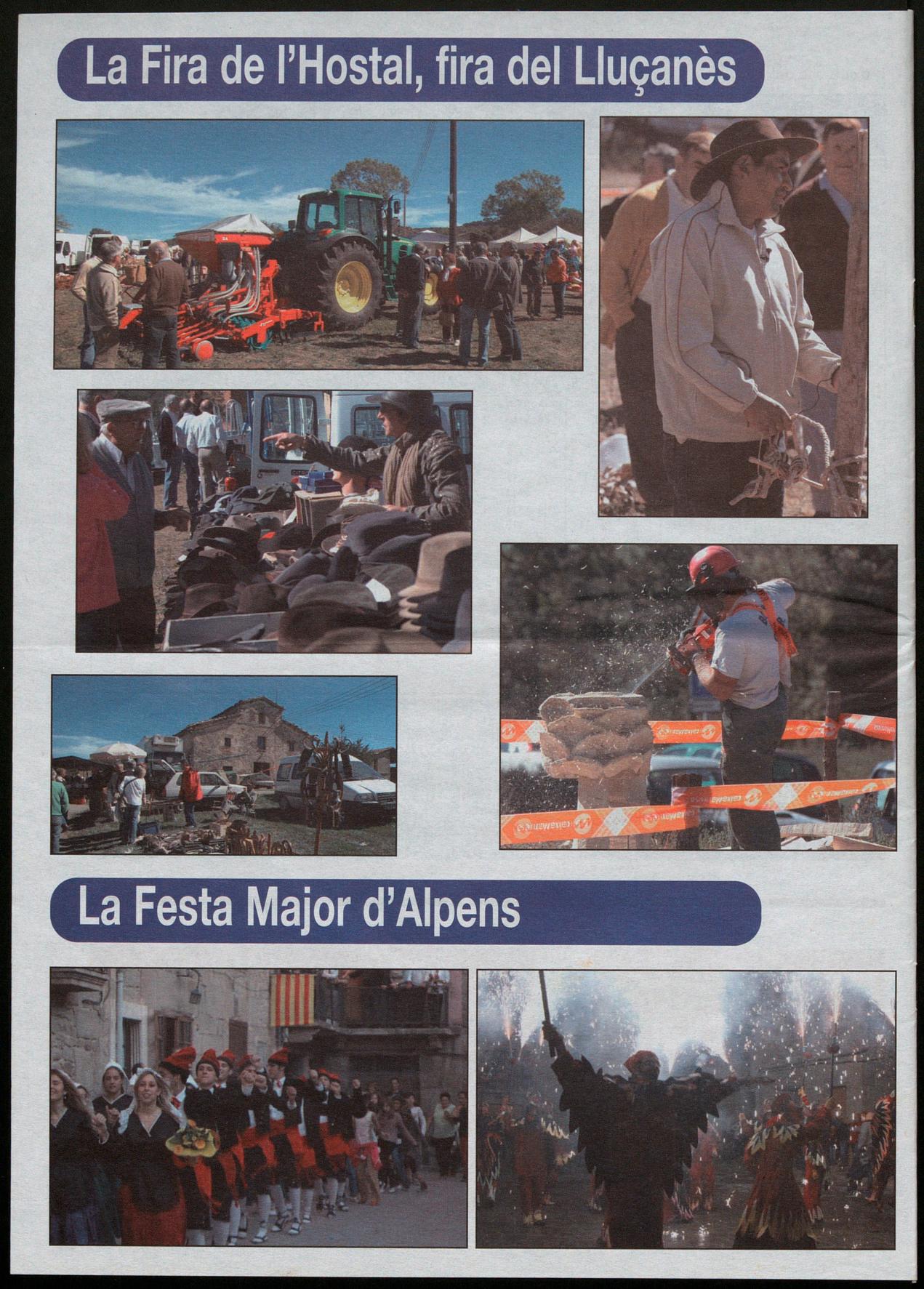 Sant Agustí de Lluçanès. - Un any més la fira a l'Hostal del Vilar va tornar a concentrar una multitud de persones provinents bàsicament del Lluçanès. El bon temps en aquesta edició va afavorir una massiva assistència, sobretot al migdia, amb un dinar molt concorregut, amb tres-cents cinquanta comensals. Enguany la demostració d'antics oficis va estar dedicada a dallar una part d'un camp deis voltants, una activitat que va atreure un bon nombre de curiosos, i a la qual, a part dels dalladors previstos, de Sant Agustí Sant Boi -Enric Dot, Francesc Rota, Josep Mas, Josep Cornellas Josep Camprubí-, s'hi va afegir una veïna de Sant Agustí que va demostrar també la seva traça amb aquest estri. Ja abans de començar van fer la preparació prèvia esmolant picant la dalla, acció que va provocar el record de molts dels assistents, que comentaven com de joves ells havien practicat aquesta feina. AI cap d'una estona va ser el torn dels tractors, que van participar en una gimcana on havien de posar el remolc en una zona en forma d'ela, canviar de lloc unes bales de palla, fer un trajecte de rotonda marxa enrera