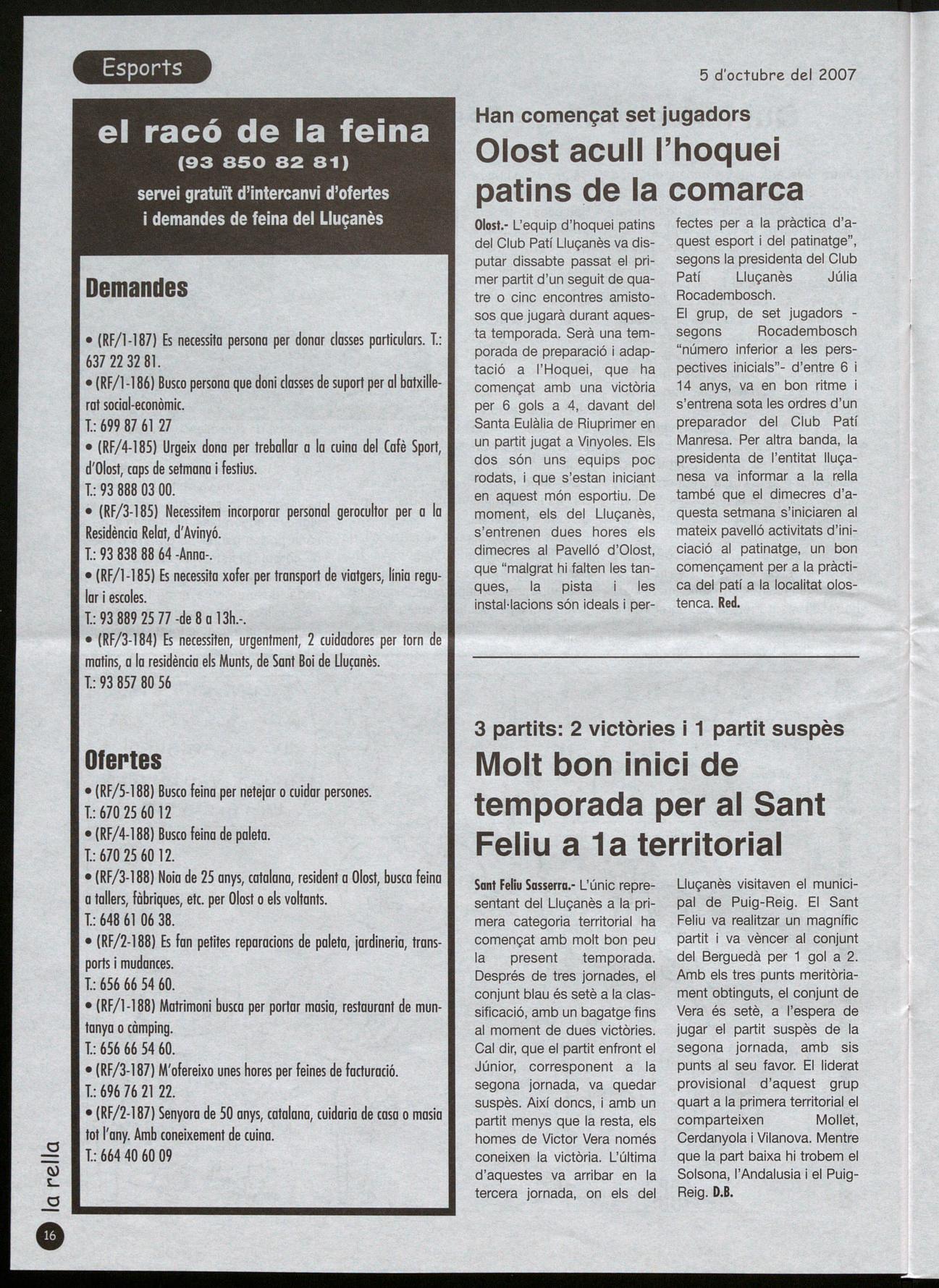 Lluçanès visitaven el municipal de Puig-Reig. El Sant Feliu va realitzar un magnífic partit i va vèncer al conjunt del Berguedà per 1 gol a 2. Amb els tres punts meritòriament obtinguts, el conjunt de Vera és setè, a l'espera de jugar el partit suspès de la segona jornada, amb sis punts al seu favor. El liderat provisional d'aquest grup quart a la primera territorial el comparteixen Mollet, Cerdanyola i Vilanova. Mentre que la part baixa hi trobem el Solsona, l'Andalusia el PuigReig. D.B.