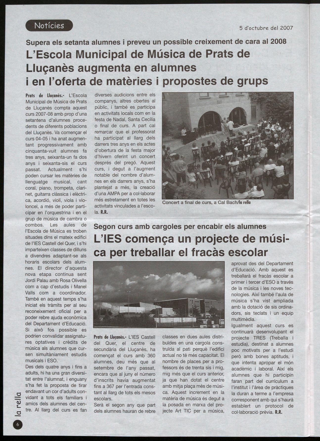 Prats de Lluçanès.- L'Escola Municipal de Música de Prats de Lluçanès compta aquest curs 2007-08 amb prop d'una setantena d'alumnes procedents de diferents poblacions del Lluçanès. Va començar el curs 04-05 i ha anat augmentant progressivament amb cinquanta-vuit alumnes fa tres anys, seixanta-un fa dos anys seixanta-sis el curs passat. Actualment s'hi poden cursar les matèries de llenguatge musical, cant coral, piano, trompeta, clarinet, guitarra clàssica i elèctrica, acordió, violí, viola violoncel, a més de poder participar en l'orquestrina i en el grup de música de cambra o combos. Les aules de l'Escola de Música es troben situades dins el mateix edifici de l'lES Castell del Quer, s'hi imparteixen classes de dilluns a divendres adaptant-se als horaris escolars dels alumnes. El director d'aquesta nova etapa continua sent Jordi Palau amb Rosa Olivella com a cap d'estudis i Manel Valls com a coordinador. També en aquest temps s'ha iniciat els tràmits per al seu reconeixement oficial per a poder rebre ajuda econòmica del Departament d'Educació. Si això fos possible es podrien convalidar assignatures optatives crèdits de música als alumnes que cursen simultàniament estudis musicals i ESO.