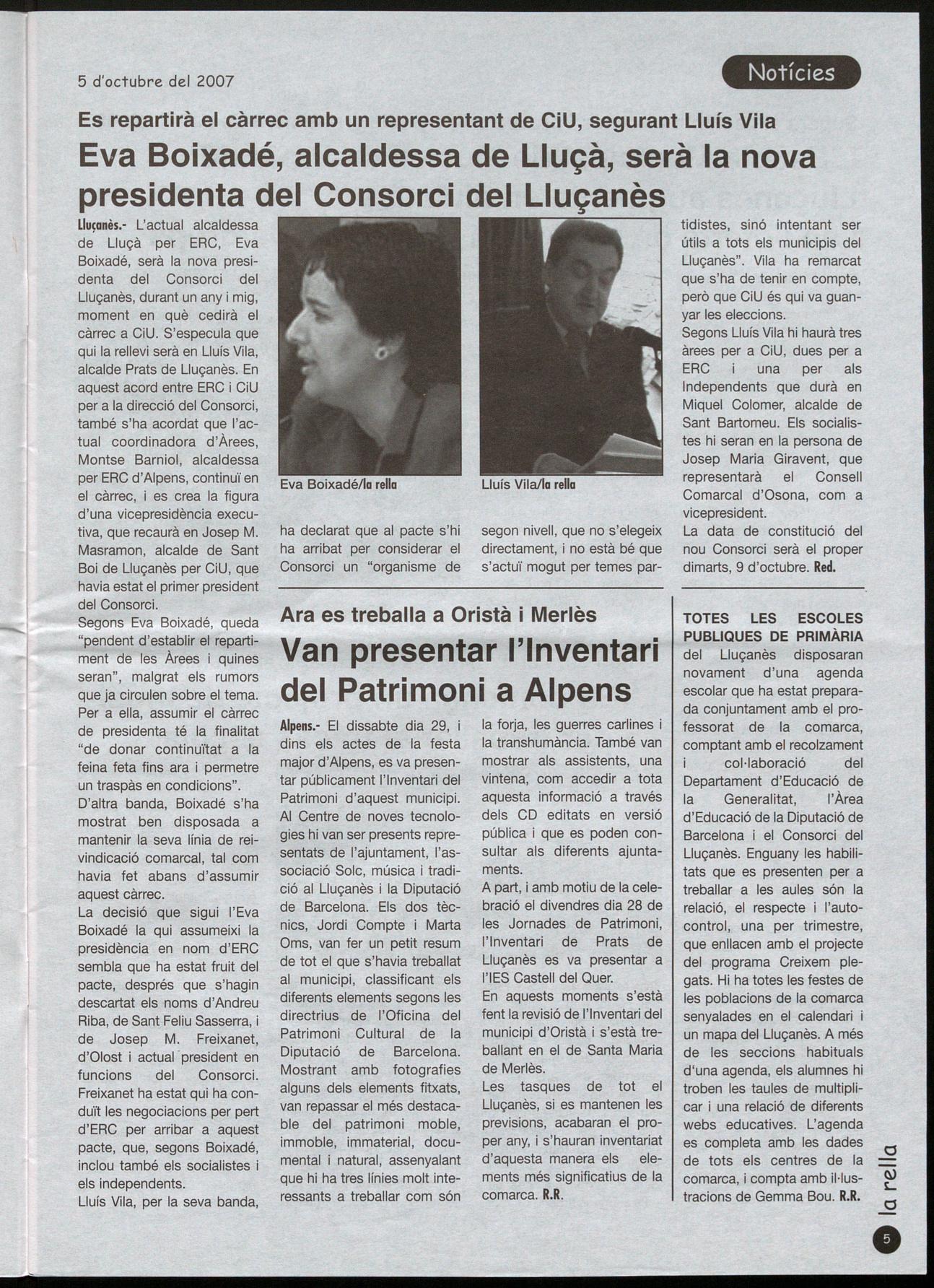 L1uçanès.- L'actual alcaldessa de Lluçà per ERC, Eva Boixadé, serà la nova presidenta del Consorci del Lluçanès, durant un any mig, moment en què cedirà el càrrec a CiU. S'especula que qui la rellevi serà en Lluís Vila, alcalde Prats de Lluçanès. En aquest acord entre ERC i CiU per a la direcció del Consorci, també s'ha acordat que l'actual coordinadora d'Àrees, Montse Barniol, alcaldessa per ERC d'Alpens, continuï en Eva Boixadé/la rella el càrrec, i es crea la figura d'una vicepresidència executiva, que recaurà en Josep M. Masramon, alcalde de Sant Boi de Lluçanès per CiU, que havia estat el primer president del Consorci.