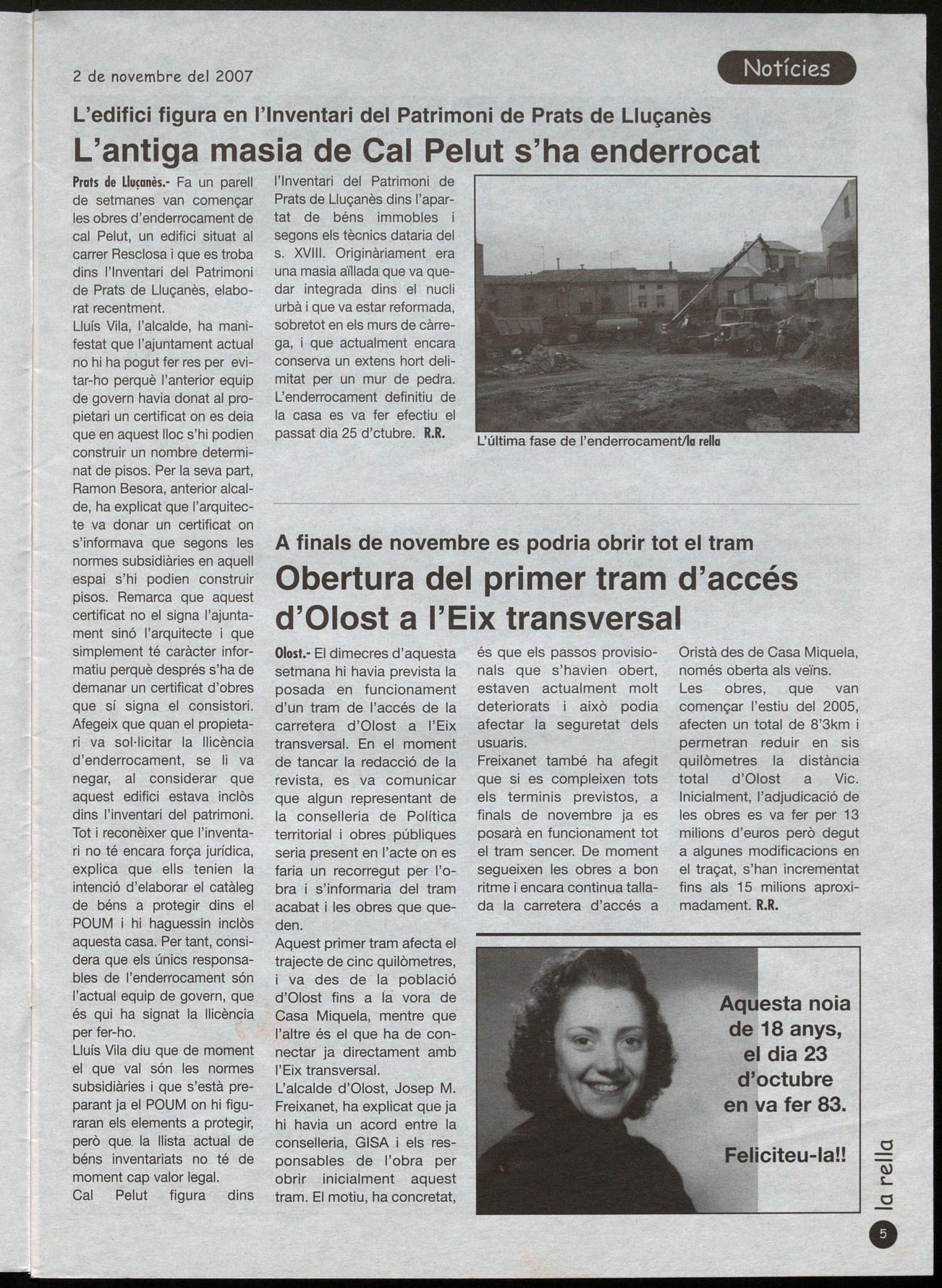 Prats de Lluçanès.- Fa un parell de setmanes van començar les obres d'enderrocament de cal Pelut, un edifici situat al carrer Resclosa que es troba dins l'Inventari del Patrimoni de Prats de Lluçanès, elaborat recentment.