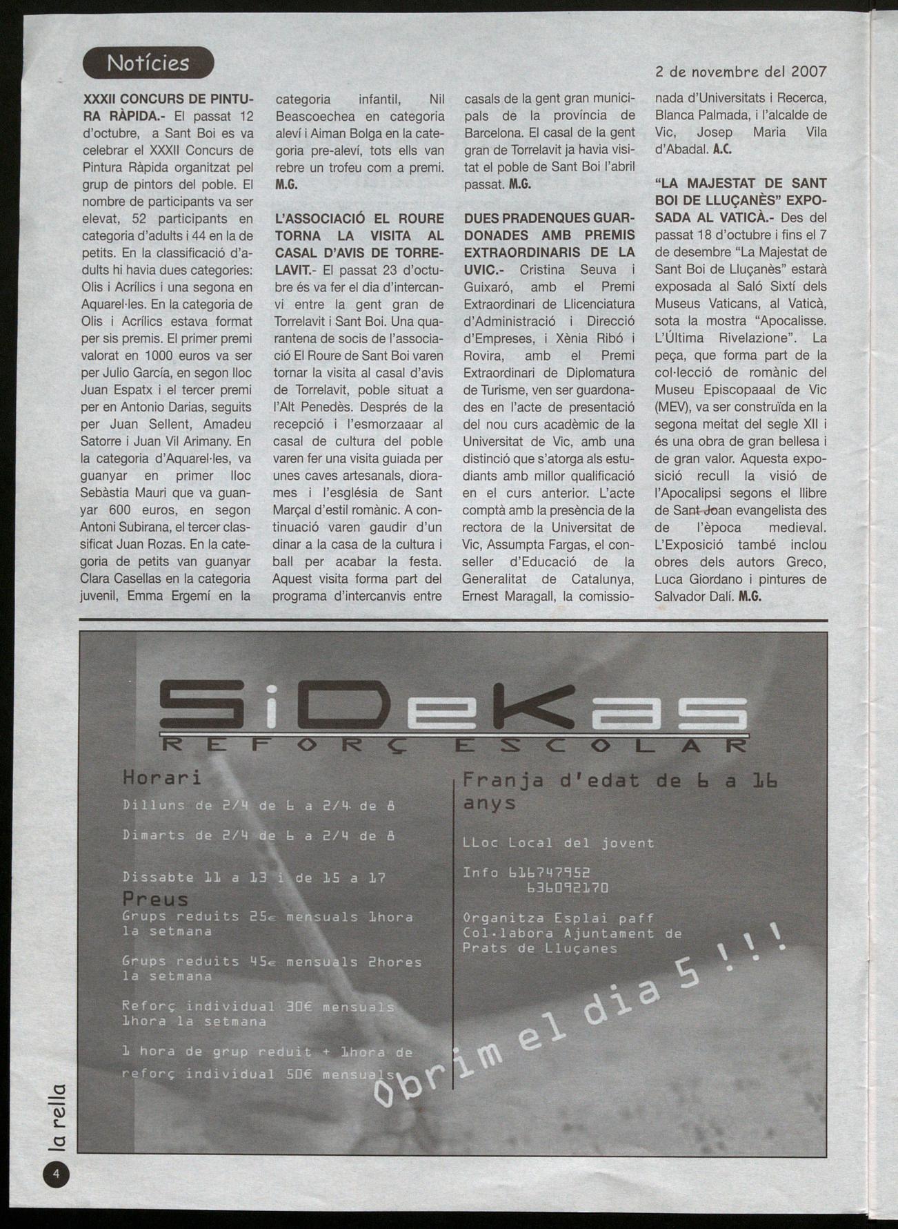 RA RÀPIDA.- El passat 12 d'octubre, a Sant Boi es va celebrar el XXXII Concurs de Pintura Ràpida organitzat pel grup de pintors del poble. El nombre de participants va ser elevat, 52 participants en categoria d'adults 44 en la de petits. En la classificació d'adults hi havia dues categories: Olis Acrílics una segona en Aquarel·les. En la categoria de Olis Acrílics estava format per sis premis. El primer premi valorat en 1000 euros va ser per Julio García, en segon lloc Juan Espatx el tercer premi per en Antonio Darias, seguits per Juan Sellent, Amadeu Satorre Juan Vil Arimany. En la categoria d'Aquarel-les, va guanyar en primer lloc