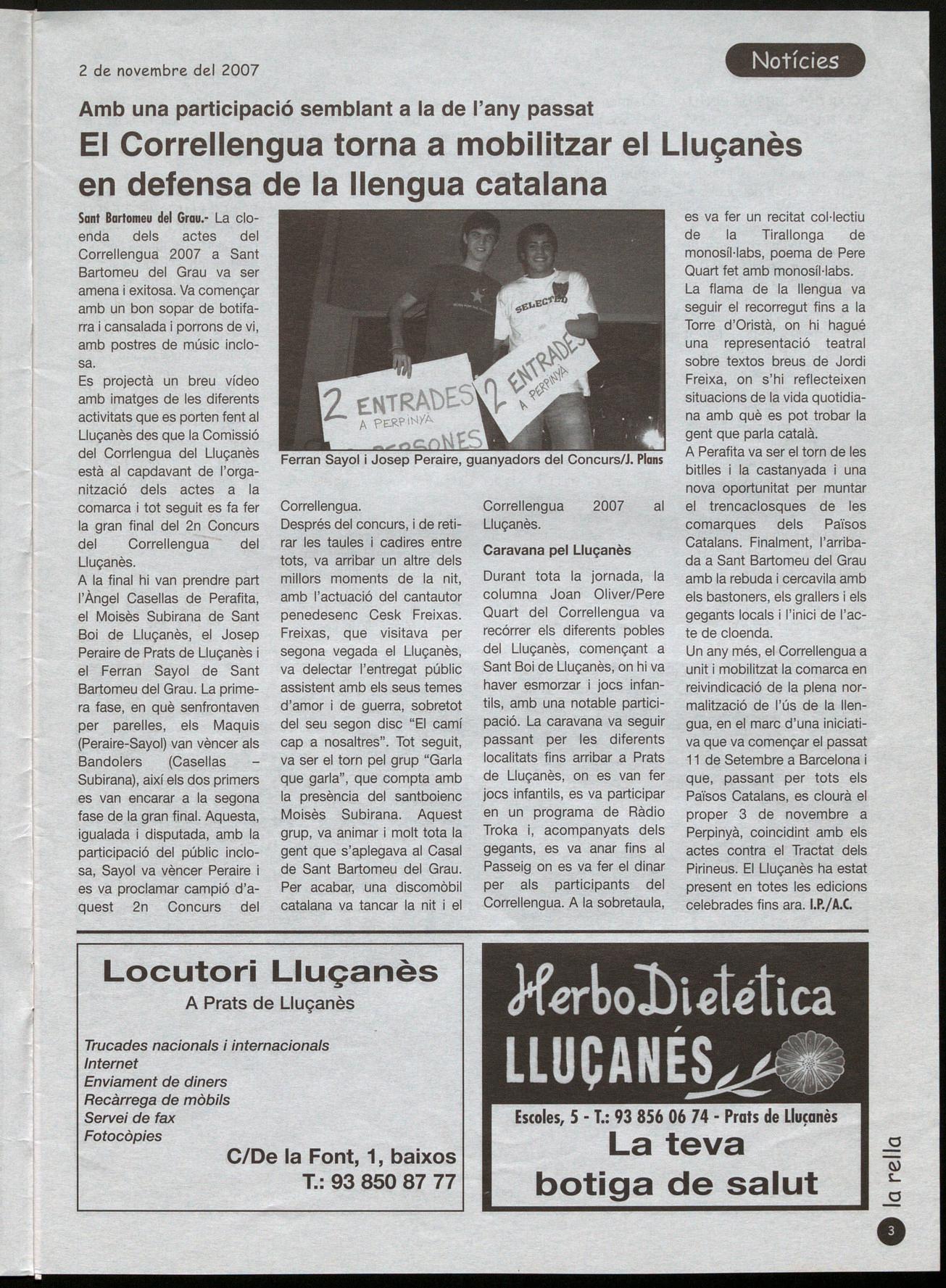 Un any més, el Correllengua a unit mobilitzat la comarca en reivindicació de la plena normalització de l'ús de la llengua, en el marc d'una iniciativa que va començar el passat 11 de Setembre a Barcelona que, passant per tots els Països Catalans, es clourà el proper 3 de novembre a Perpinyà, coincidint amb els actes contra el Tractat dels Pirineus. El Lluçanès ha estat present en totes les edicions celebrades fins ara. I.P.jA.C.