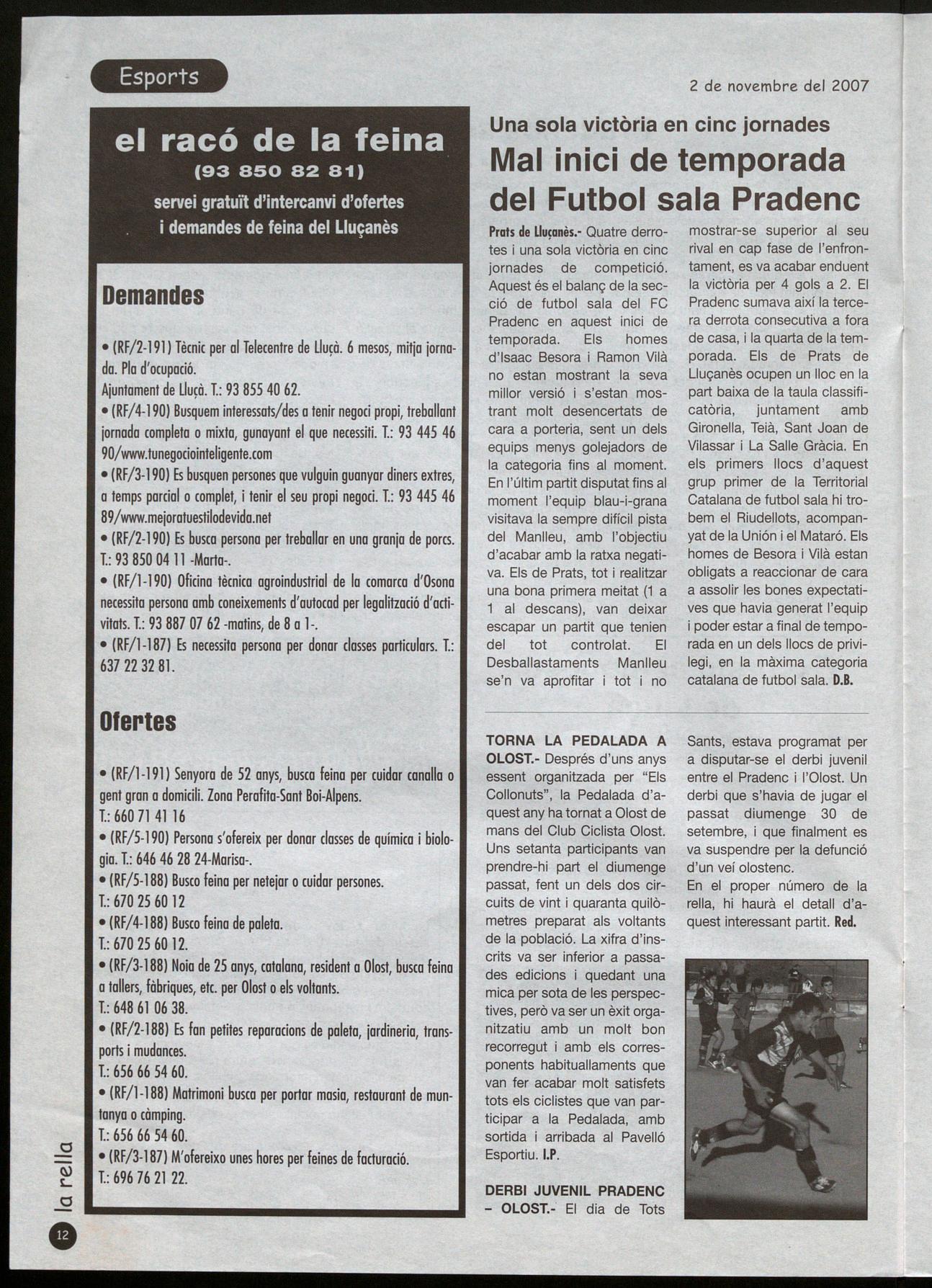 mostrar-se superior al seu rival en cap fase de l'enfrontament, es va acabar enduent la victòria per 4 gols a 2. El Pradenc sumava així la tercera derrota consecutiva a fora de casa, la quarta de la temporada. Els de Prats de Lluçanès ocupen un lloc en la part baixa de la taula classificatòria, juntament amb Gironella, Teià, Sant Joan de Vilassar La Salle Gràcia. En els primers llocs d'aquest grup primer de la Territorial Catalana de futbol sala hi trobem el Riudellots, acompanyat de la Unión i el Mataró. Els homes de Besora Vilà estan obligats a reaccionar de cara a assolir les bones expectatives que havia generat l'equip poder estar a final de temporada en un dels llocs de privilegi, en la màxima categoria catalana de futbol sala. D.B.