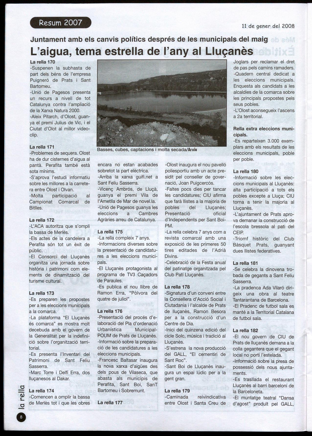Des de fa uns anys, diferents pobles del Lluçanès estan patint un problema que va augmentant any rere any i poble rere poble: l'aigua. AI poble d'Alpens ja fa uns quatre o cinc estius que estem patint el problema d'escassetat d'aigua per la manca de pluges. Finalment aquest estiu 2007 hem caigut i ens han hagut de salvar els pous de Vilaseca de Sant Bartomeu del Grau. Fa uns mesos ja havien passat una carta des de l'ajuntament d'Alpens a tots els veïns dient que s'estaven esgotant les reserves d'aigua potable del poble, però va semblar que la majoria de gent no en feia cabal. També van dir que al mes de desembre es començaria a omplir la bassa de Petja que té una capacitat d'emmagatzemar 4 milions de litres d'aigua, però jo personalment trobo que la riera Lluçanesa, que es d'on bombarien l'aigua per omplir la