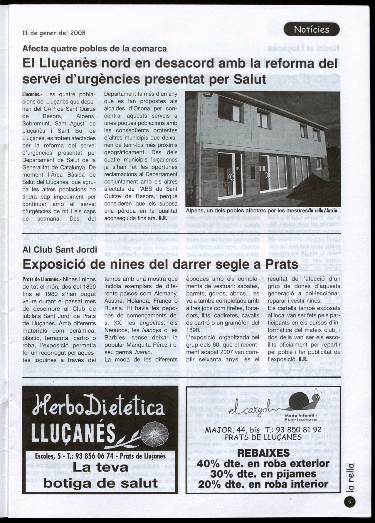 Lluçanès.- Les quatre poblacions del Lluçanès que depenen del CAP de Sant Quirze de Besora, Alpens, Sobremunt, Sant Agustí de Lluçanès Sant Boi de Lluçanès, es troben afectades per la reforma del servei d'urgències presentat pel Departament de Salut de la Generalitat de Catalunya. De moment l'Àrea Bàsica de Salut del Lluçanès, que agrupa les altres poblacions no tindrà cap impediment per continuar amb el servei d'urgències de nit i els caps de setmana. Des del