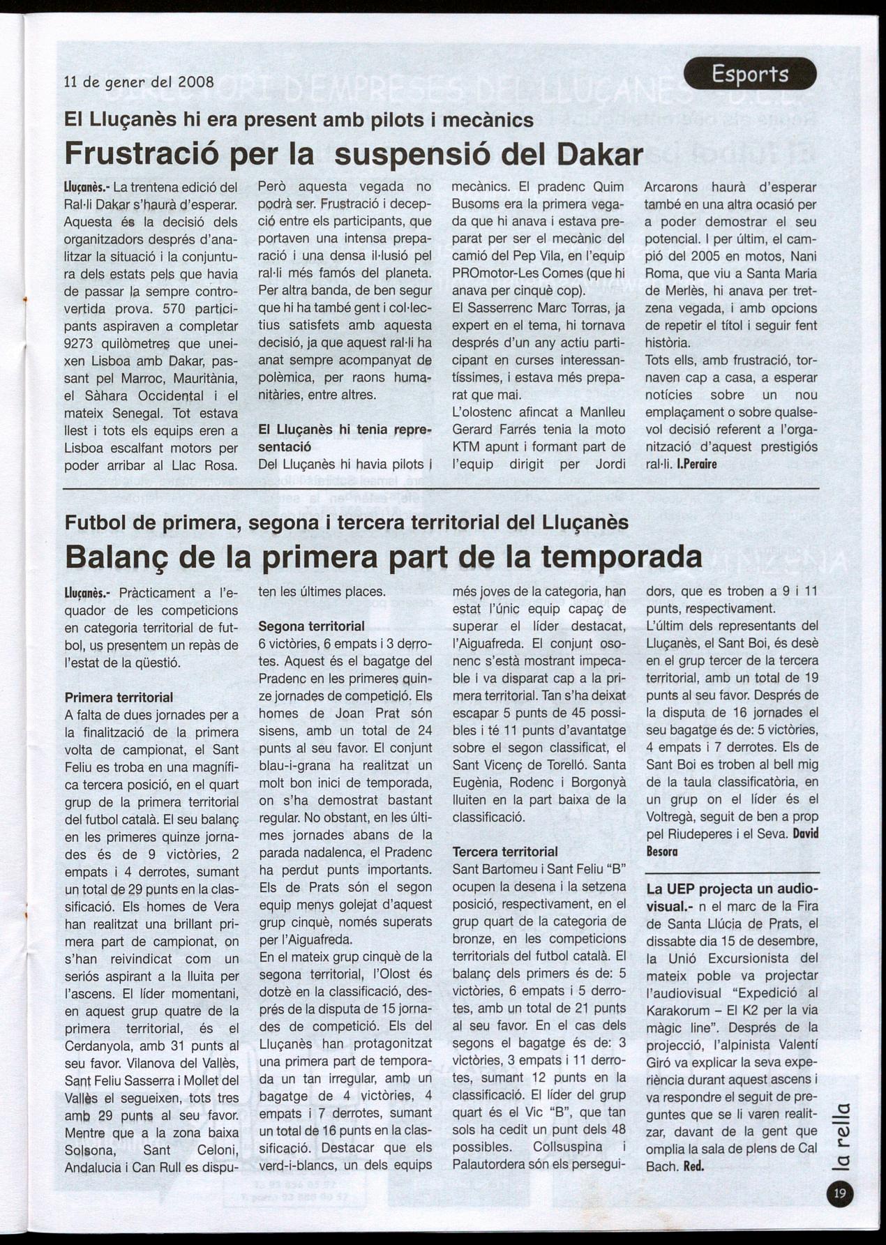 Lluçanès.- La trentena edició del Ral·li Dakar s'haurà d'esperar, Aquesta é$ la decisió dels organitzadors després d'analitzar la situació la conjuntura dels estats pels que havia de passar ¡¡a sempre contrevertida prova. 570 participants aspiraven a completar 9273 quilòmetres que uneixen Lisboa amb Dakar, passant pel Marroc, Mauritània, el Sàhara Occidental el mateix Senegal. Tot estava llest tots els equips eren a Lisboa escalfant motors per poder arribar al Llac Rosa.