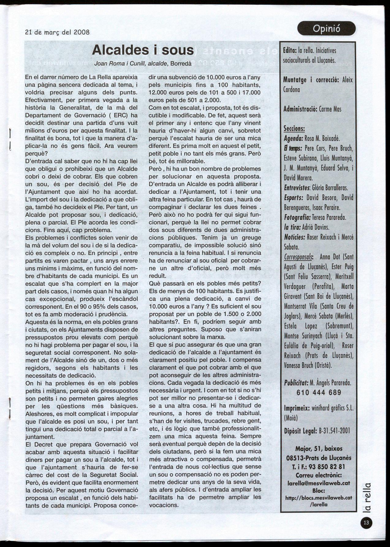 la rella és la revista de la comarca. Per això, té de tot: encerts, errors, amics, detractors, coses per millorar i coses per recuperar la rella és esperada amb desig i amb recels. Hi ha