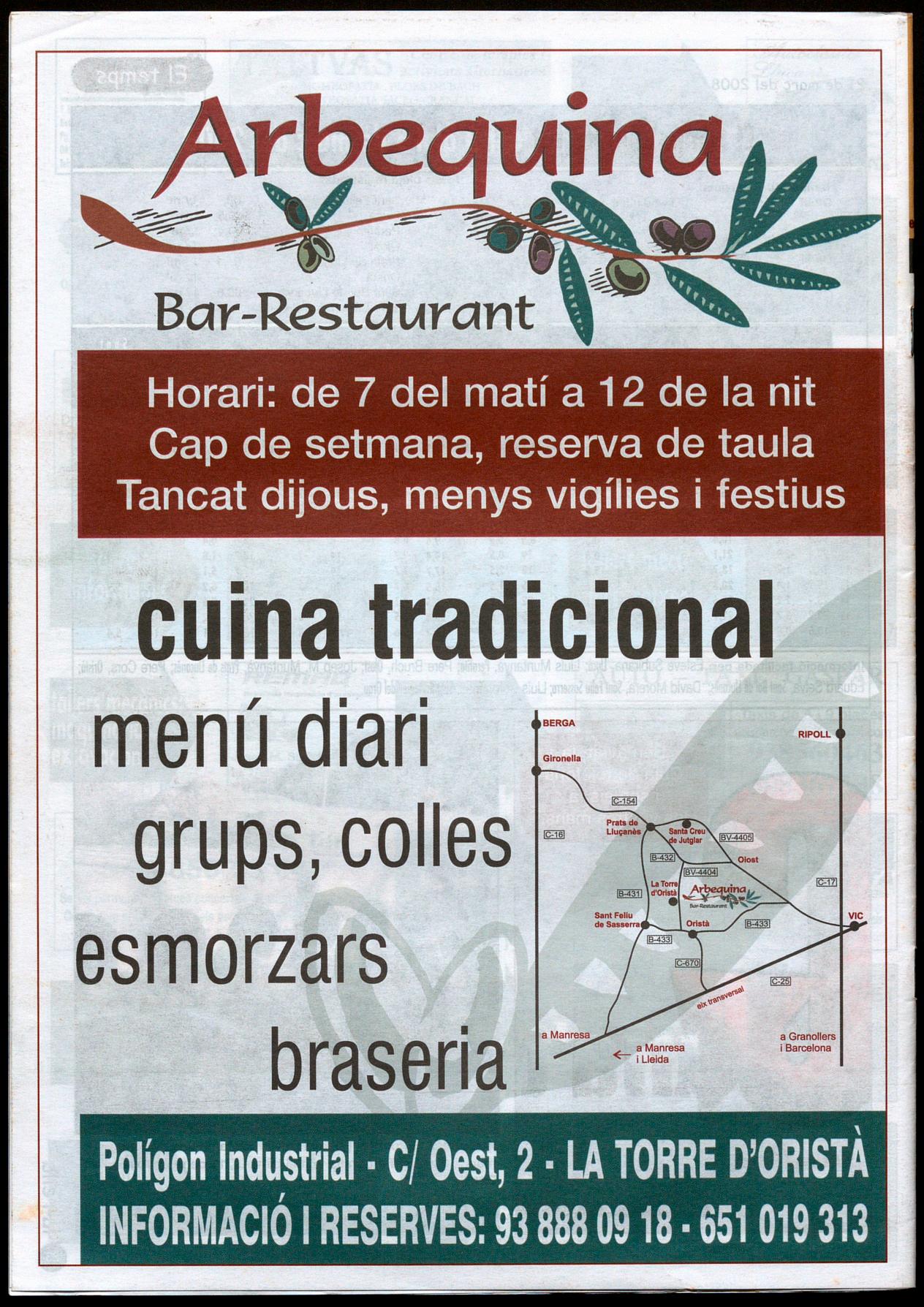 (RF/1-195) Es necessita personal de cuina i cambrers per a bar-restaurant de nova obertura a la Torre d'Oristà. 1: 651 019 313.