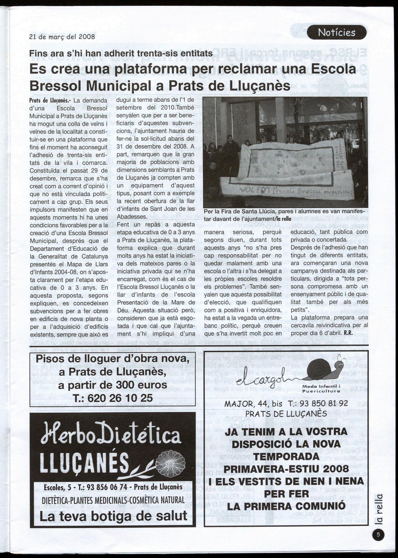 Prats de Llusanès.- La demanda d'una Escola Bressol Municipal a Prats de Lluçanès ha mogut una colla de veïns veïnes de la localitat a constituir-se en una plataforma que fins el moment ha aconseguit l'adhesió de trenta-sis entitats de la vila comarca. Constituïda el passat 29 de desembre, remarca que s'ha creat com a corrent d'opinió que no està vinculada políticament a cap grup. Els seus impulsors manifesten que en aquests moments hi ha unes condicions favorables per a la creació d'una Escola Bressol Municipal, després que el Departament d'Educació de la Generalitat de Catalunya presentés el Mapa de Llars d'Infants 2004-08, on s'aposta clarament per l'etapa educativa de O a 3 anys. En aquesta proposta, segons expliquen, es concedeixen subvencions per a fer obres en edificis de nova planta a per a l'adquisició d'edificis existents, sempre que això es