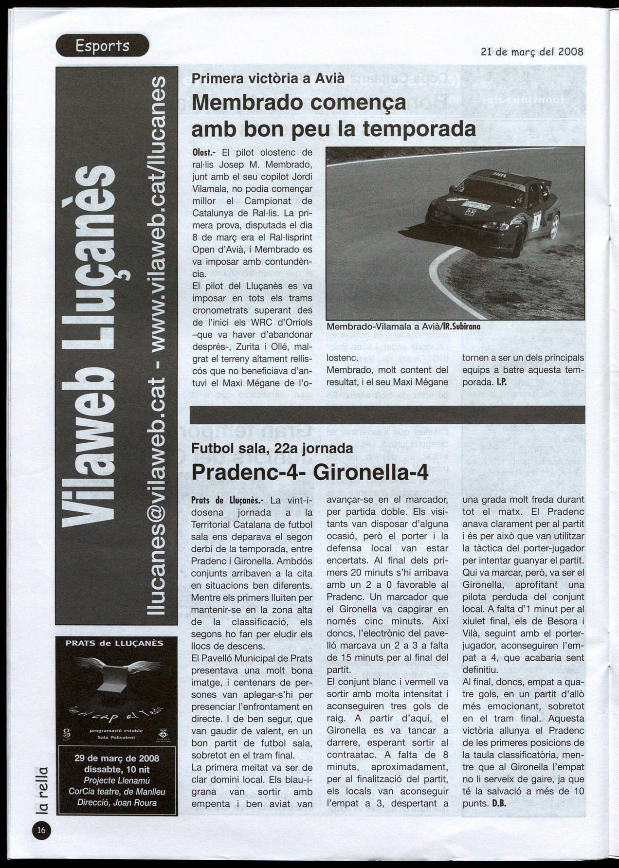 Olast.- El pilot olostenc de ral·lis Josep M. Membrada, junt amb el seu copilot Jordi Vilamala, no podia començar millor el Campionat de Catalunya de Ral·lis. La primera prova, disputada el dia 8 de març era el Ral-lisprint Open d'Avià, Membrada es va imposar amb contundència.