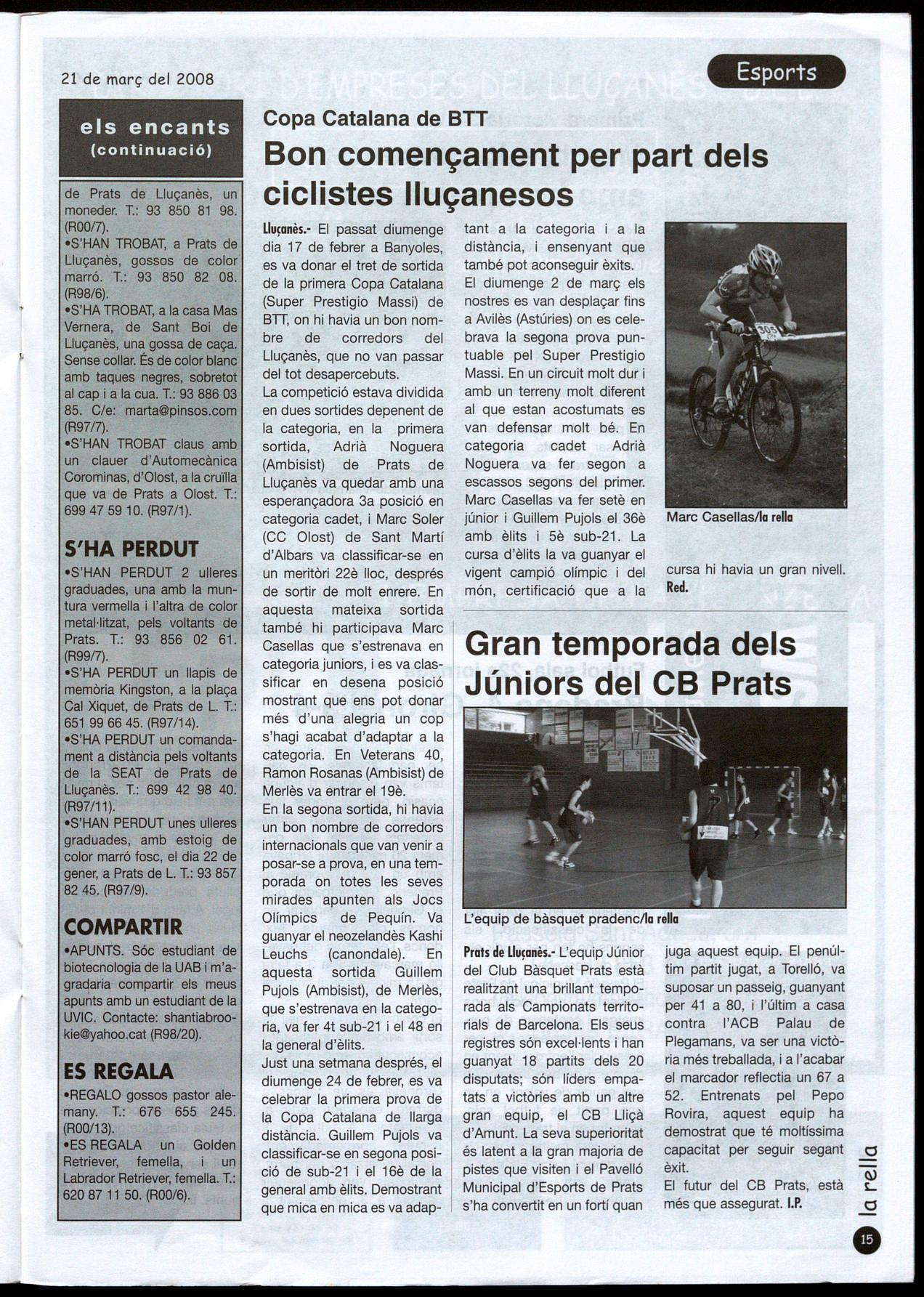 tant a la categoria i a la distància, ensenyant que també pot aconseguir èxits. El diumenge 2 de març els nostres es van desplaçar fins a Avilès (Astúries) on es celebrava la segona prova puntuable pel Super Prestigio Massi. En un circuit molt dur amb un terreny molt diferent al que estan acostumats es van defensar molt bé. En categoria cadet Adrià Noguera va fer segon a escassos segons del primer. Marc Casellas va fer setè en júnior Guillem Pujols el 36è amb èlits i 5è sub-21. La cursa d'èlits la va guanyar el vigent campió olímpic del món, certificació que a la