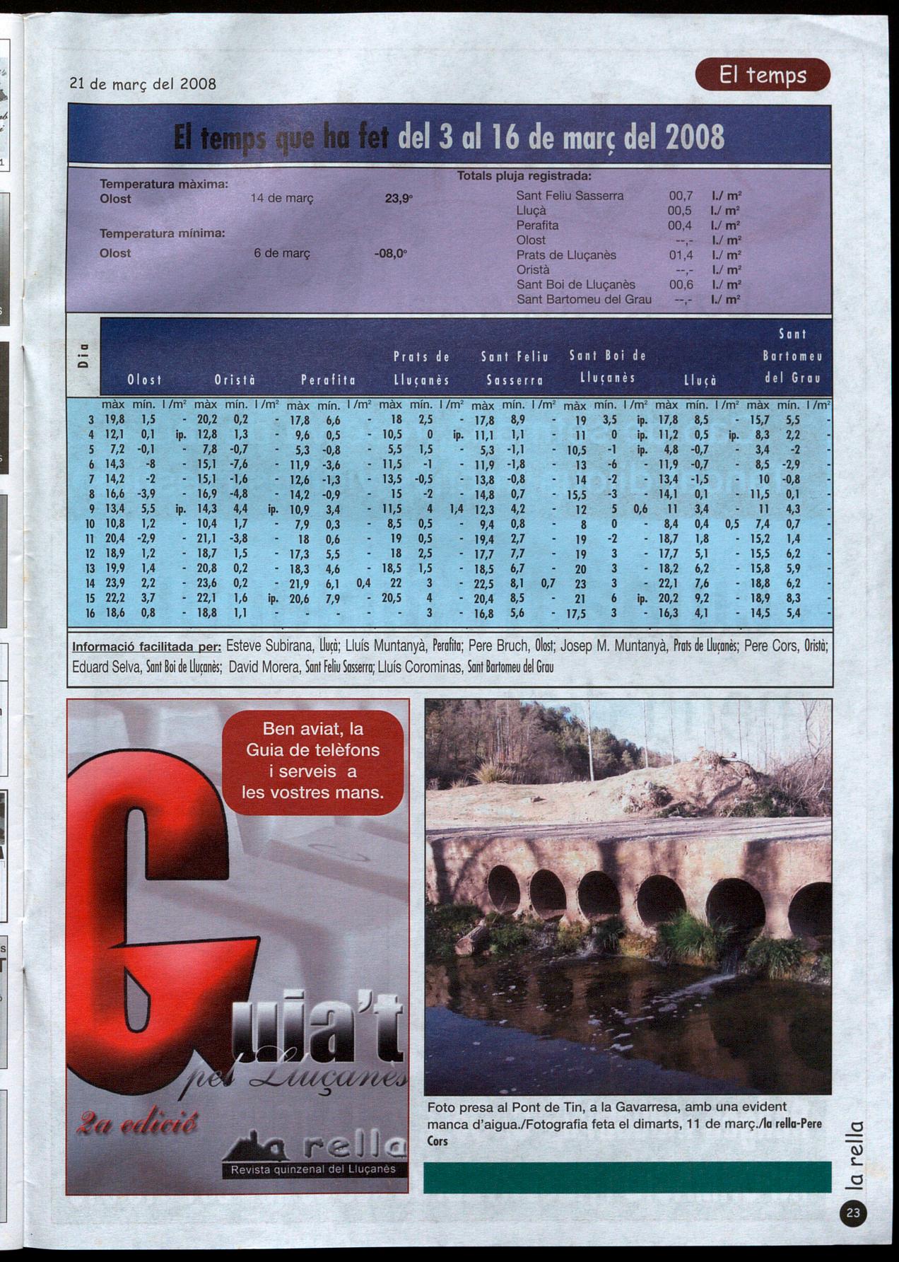 Informació facilitada per: Esteve Subirana, Llu¡à; Lluís Muntanyà, Perafila; Pere Bruch, Olosl; Josep M. Muntanyà, Prals �e Uu¡anès; Pere Cors, Orislà; Eduard Selva, Sani Boi �e Llu¡anès; David Morera, Sani �eliu Sasserra; Lluís Corominas, Sani Bartomeu �el Grau l s r Foto presa al Pont de Tin, a la Gavarresa, amb una evident manca d'aigua.lFotografia feta el dimarts, 11 de març.lla rella-Pere (ors