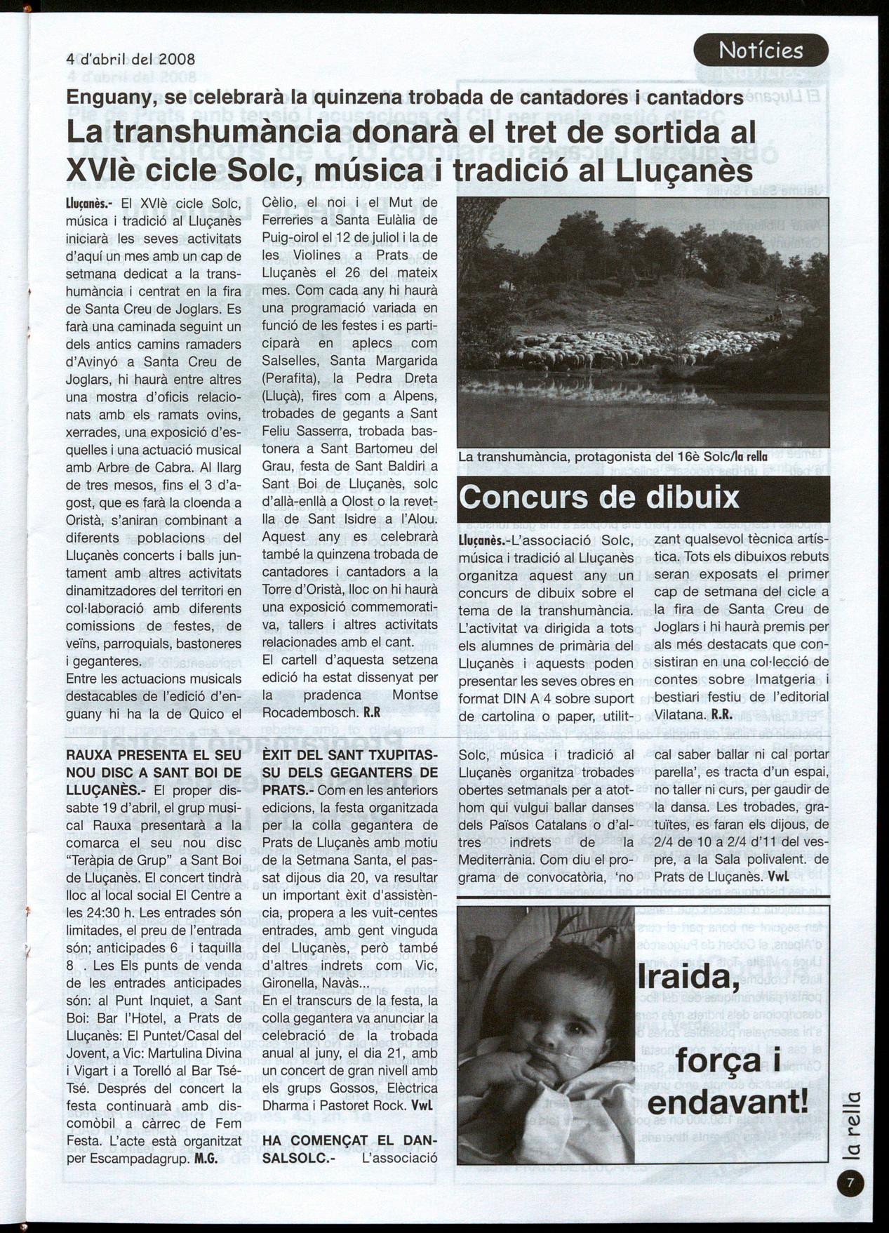 Lluçanès.- El XVlè cicle Solc, música i tradició al Lluçanès iniciarà les seves activitats d'aquí un mes amb un cap de setmana dedicat a la transhumància centrat en la fira de Santa Creu de Joglars. Es farà una caminada seguint un dels antics camins ramaders d'Avinyó a Santa Creu de Joglars, hi haurà entre altres una mostra d'oficis relacionats amb els ramats ovins, xerrades, una exposició d'esquelles una actuació musical amb Arbre de Cabra. AI llarg de tres mesos, fins el. 3 d'agost, que es farà la cloenda a Oristà, s'aniran combinant a diterents poblacions del Lluçanès concerts balls juntament amb altres activitats dinamitzadores del territori en col-Iaboració amb diferents comissions de festes, de veïns, parroquiàls, bastoneres geganteres.