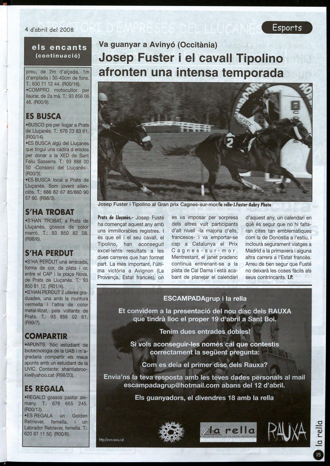 Prats de L1uçanès.- Josep Fusté ha començat aquest any amb uns immillorables registres. I és que ell i el seu cavall, el Tipolino, han aconseguit excel·lents resultats a les dues carreres que han format part. La més important, l'última victòria a Avignon (La Provença, Estat francès), on