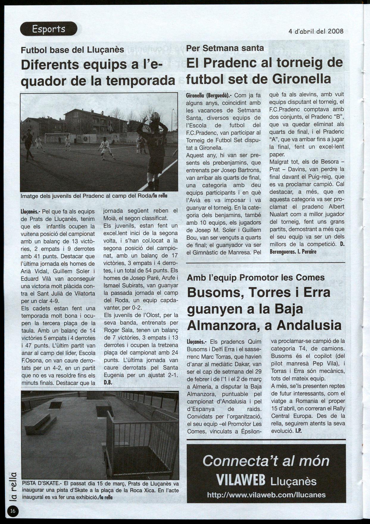 Gironella (Berguedà).- Com ja fa alguns anys, coincidint amb les vacances de Setmana Santa, diversos equips de l'Escala de futbol del F.C.Pradenc, van participar al Torneig de Futbol Set disputat a Gironella.