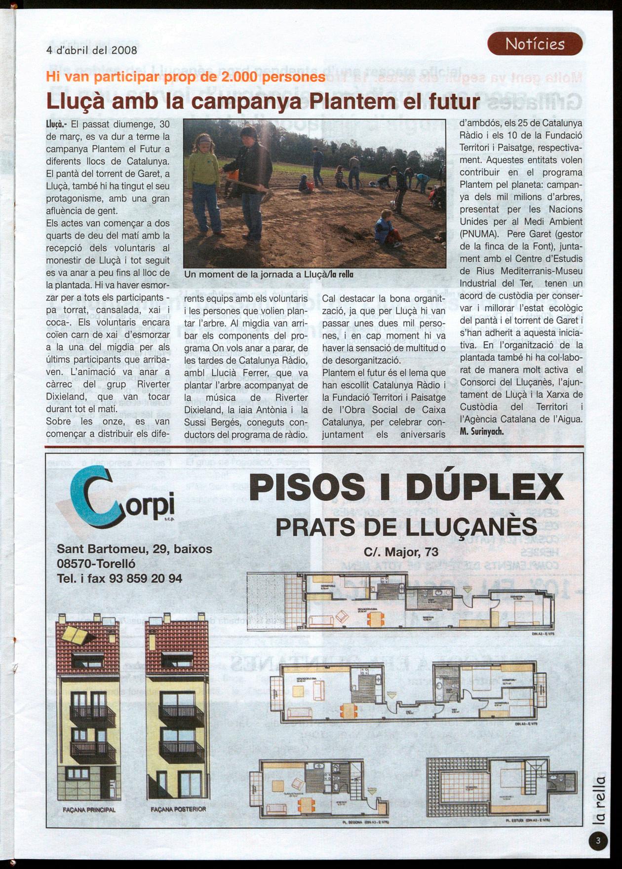 Llu�à.· El passat diumenge, 30 de març, es va dur a terme la campanya Plantem el Futur a diferents llocs de Catalunya. El pantà del torrent de Garet, a Lluçà, també hi ha tingut el seu protagonisme, amb una gran afluència de gent.