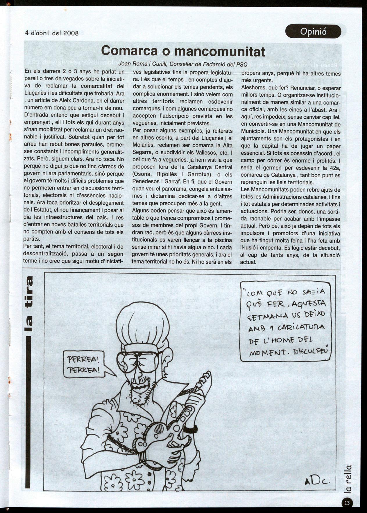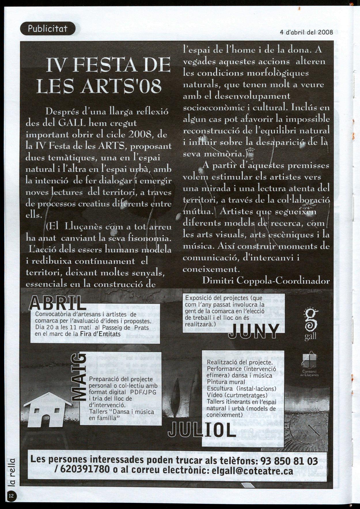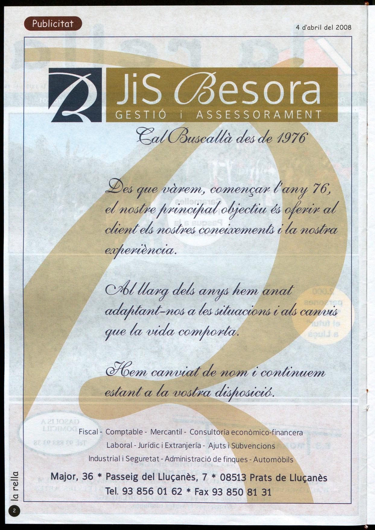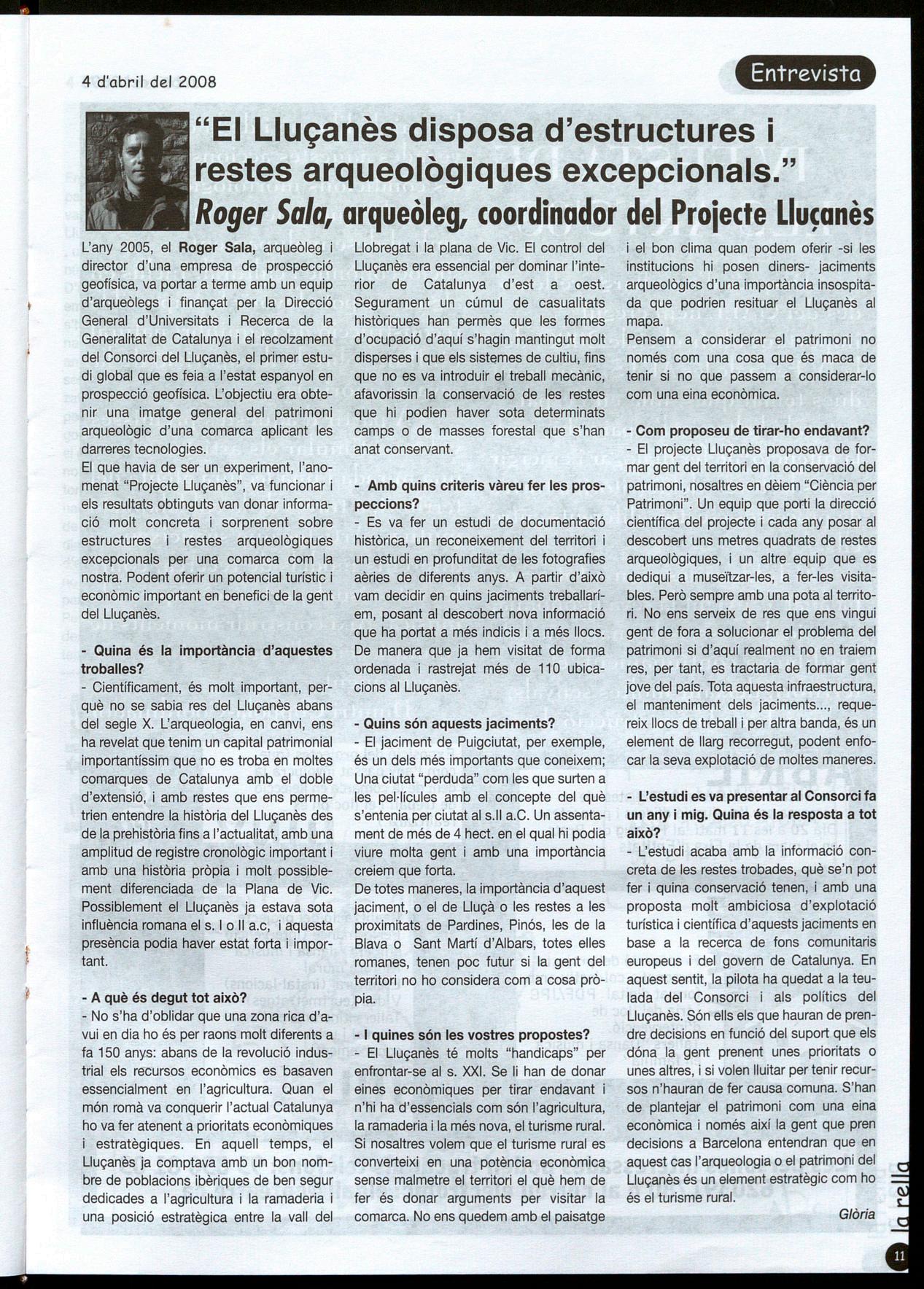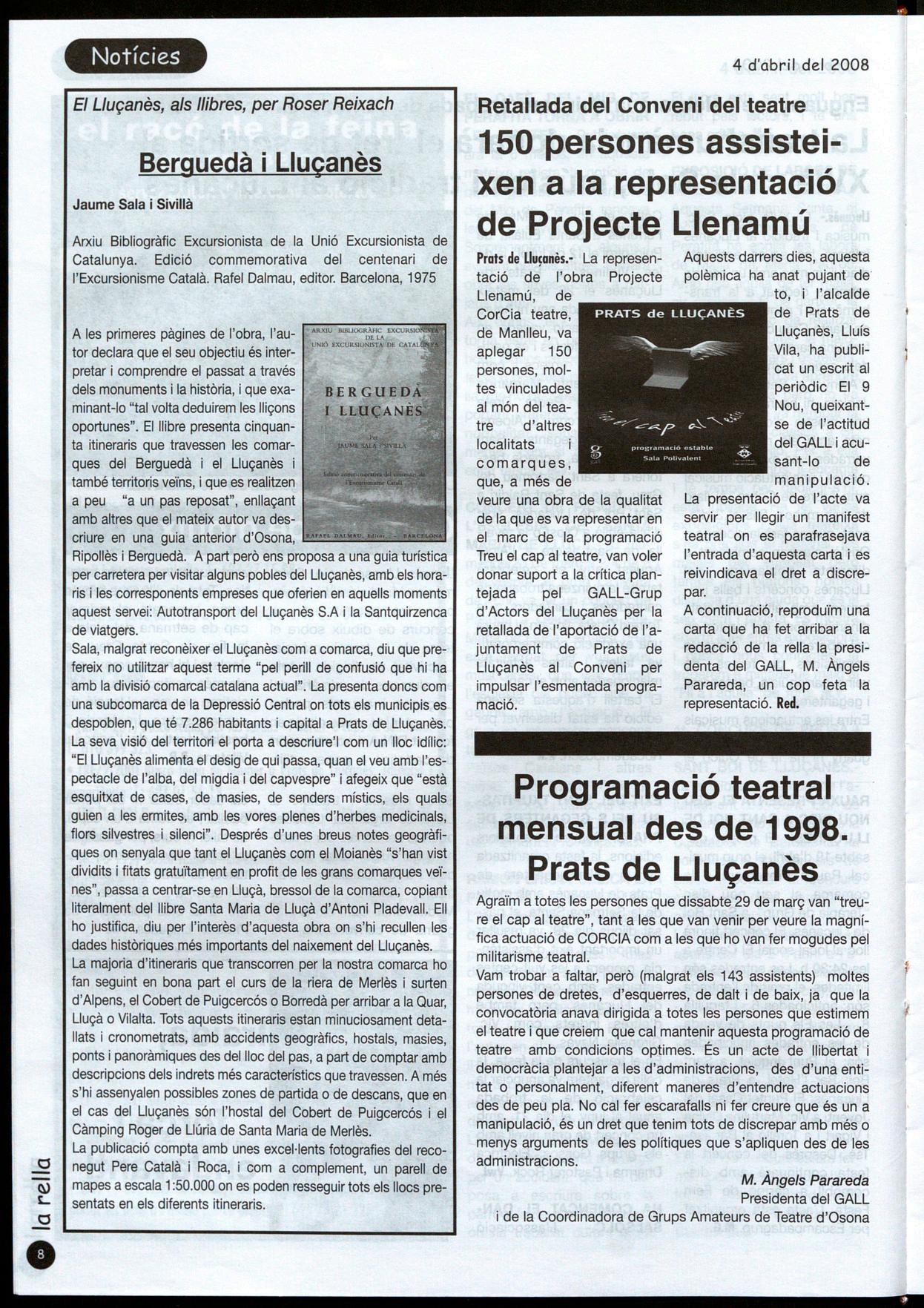 DE PASQUA A L'ESGLÉSIA DE SANTA MARIA DE LLUÇÀ.- El diumenge 23 de març a 2/4 de 8 del vespre, el grup La Mata de Jonc va fer un concert de Pasqua a l'església de Sta. Maria de Lluçà. Aquest grup està format per vuit veus masculines, que van omplir l'església del públic que va gaudir amb l'actuació. El grup va interpretar cançons tradicionals d'arreu dels Països Catalans altres temes, com Txoria Txori de Mikel Laboa, i cançons tradicionals de Niça, d'Occitània, del Piemont i Provença. M.S.