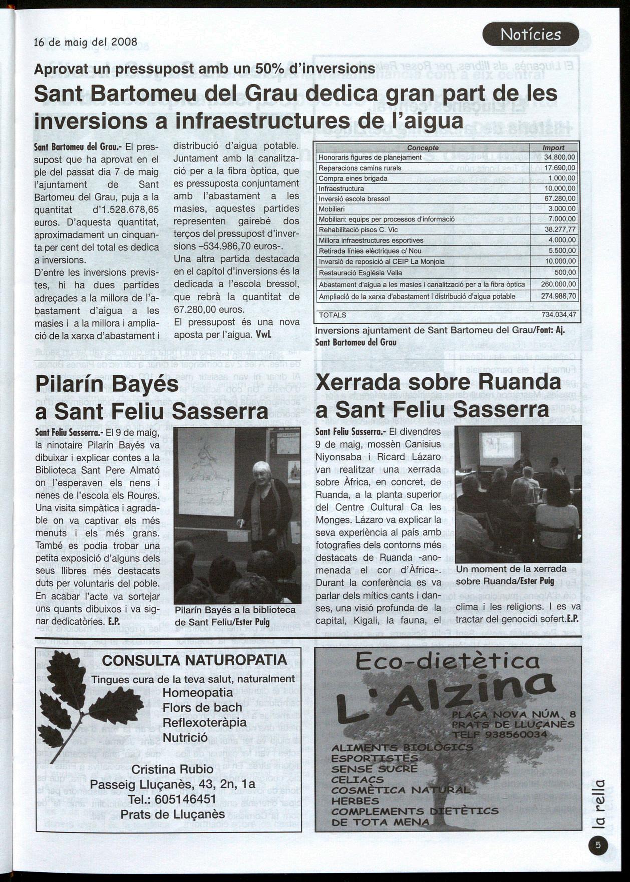 Sant Bartomeu del Grau.- El pressupost que ha aprovat en el ple del passat dia 7 de maig l'ajuntament de Sant Bartomeu del Grau, puja a la quantitat d'1.528.678,65 euros. D'aquesta quantitat, aproximadament un cinquanta per cent del total es dedica a inversions.