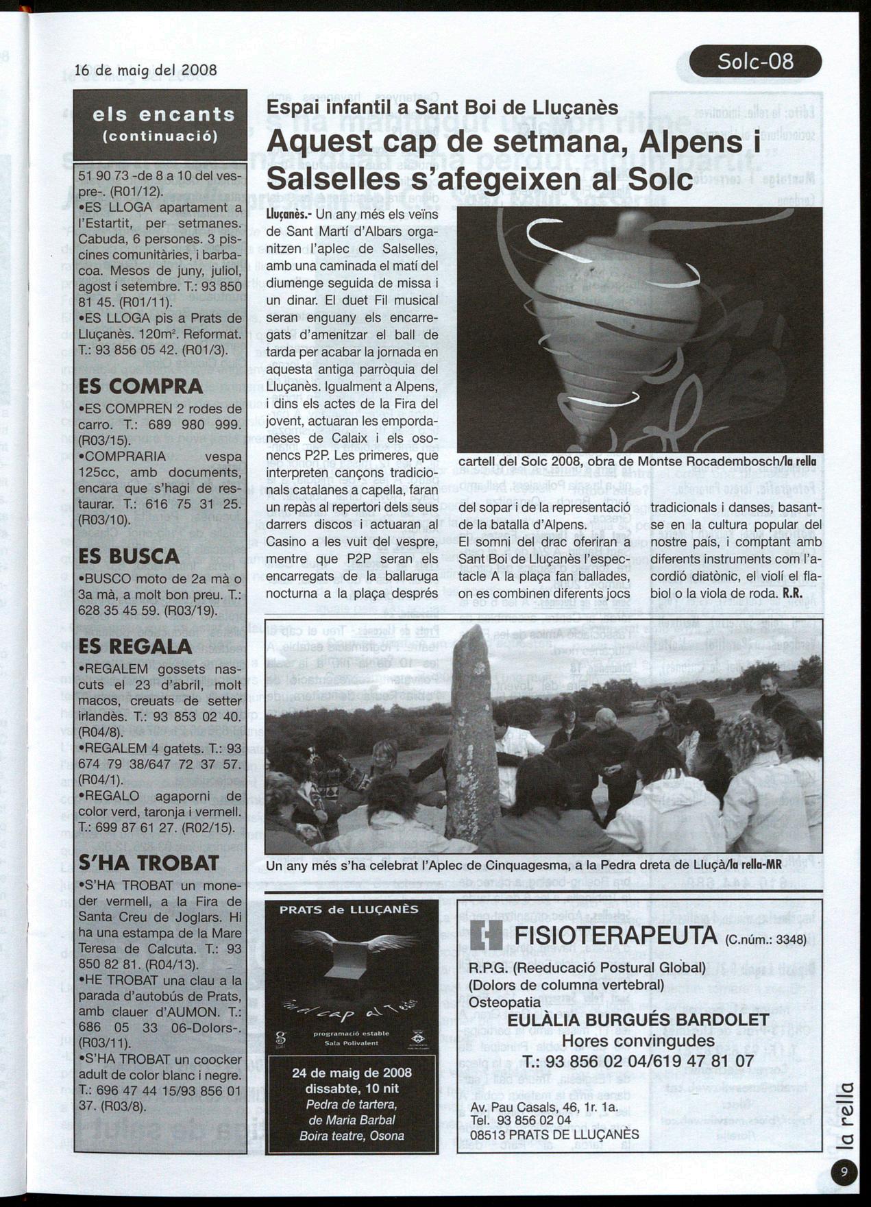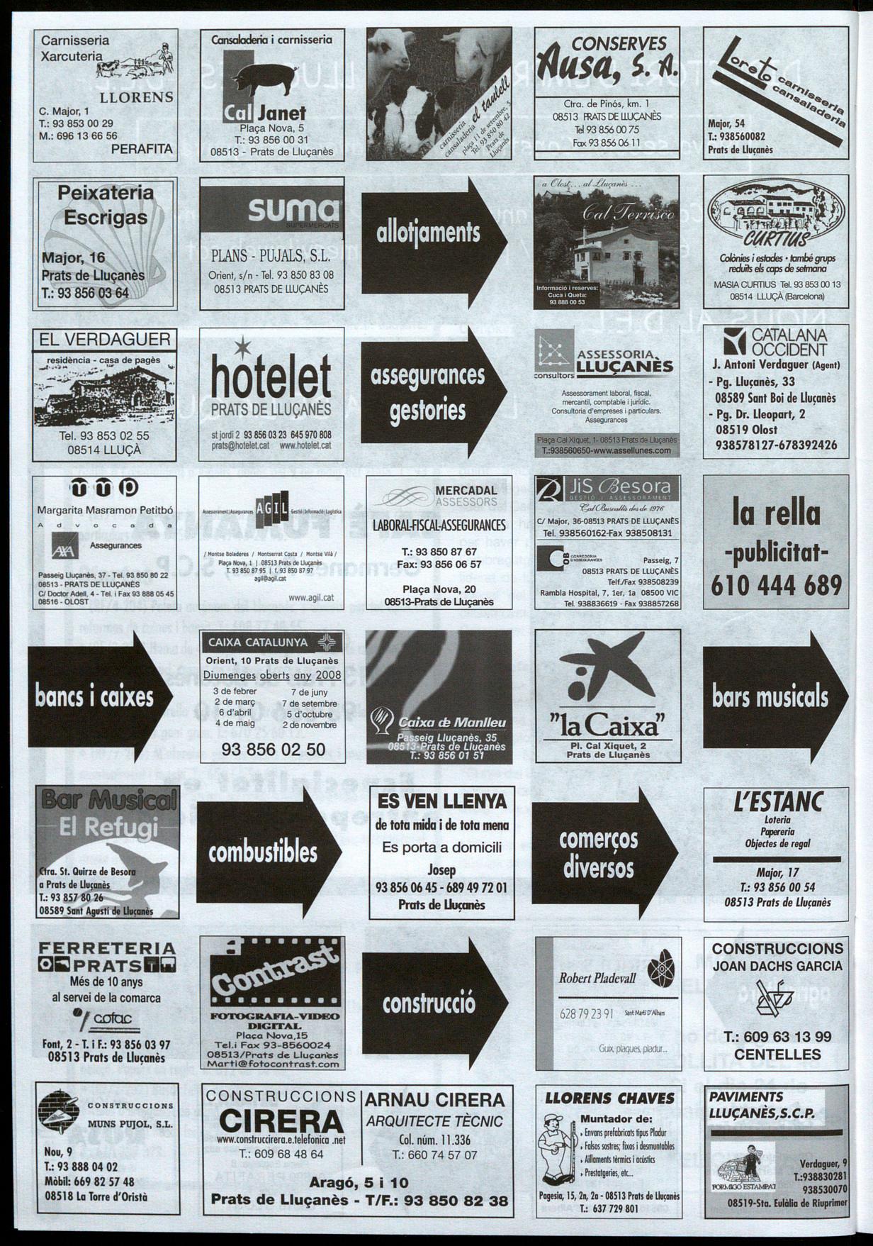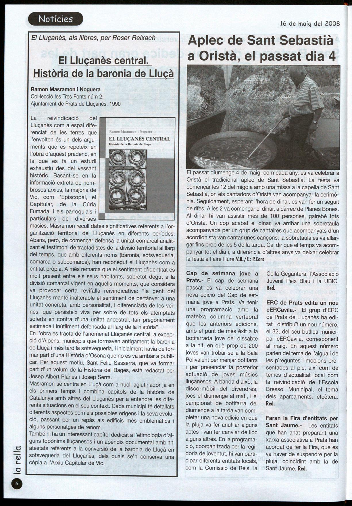 Cap de setmana jove a Prats.- El cap de setmana passat es va celebrar una nova edició del Cap de setmana jove a Prats. Va tenir una programació amb la mateixa columna vertebral que les anteriors edicions, amb el punt de més èxit a la botifarrada jove del dissabte a la nit, en què prop de 200 joves van trobar-se a la Sala Polivalent per menjar botifarra per presenciar la posterior actuació de joves músics lluçanesos. A banda d'això, la disco-mòbil del divendres, jocs el diumenge al matí, el campionat de botifarra del diumenge a la tarda van completar una nova edició en què la pluja va fer anur-lar alguns actes i van fer canviar de lloc alguns altres. En la programació, coorganitzada per la regidoria de joventut, hi van participar diferents entitats locals, com la Comissió de Reis, la