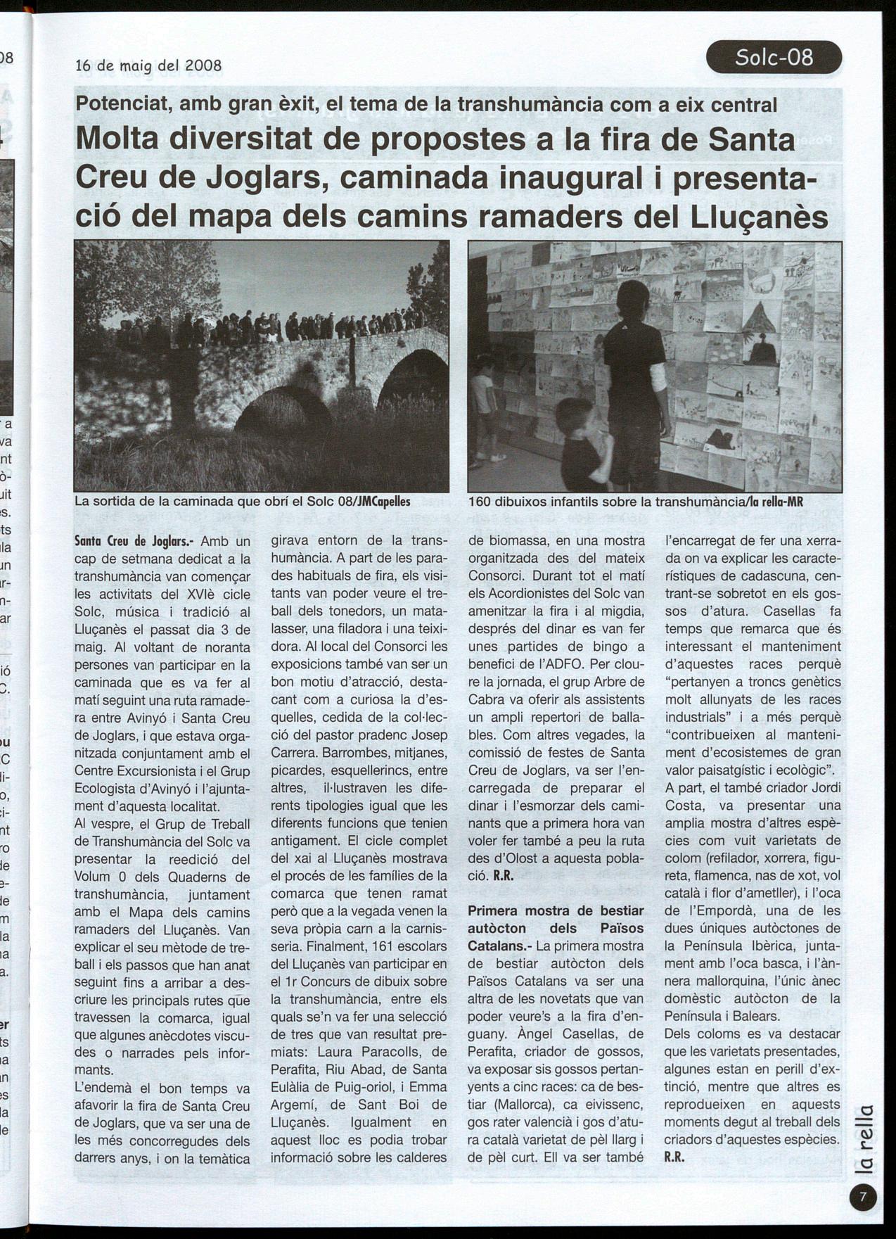 Santa Creu de Joglars.- Amb un cap de setmana dedicat a la transhumància van començar les activitats del XVlè cicle Solc, música i tradició al Lluçanès el passat dia 3 de maig. AI voltant de noranta persones van participar en la caminada que es va fer al matí seguint una ruta ramadera entre Avinyó Santa Creu de Joglars, que estava organitzada conjuntament amb el Centre Excursionista i el Grup Ecologista d'Avinyó l'ajuntament d'aquesta localitat. AI vespre, el Grup de Treball de Transhumància del Solc va presentar la reedició del Volum O dels Quaderns de transhumància, juntament amb el Mapa dels camins ramaders del Lluçanès. Van explicar el seu mètode de treball els passos que han anat seguint fins a arribar a de_scriure les principals rutes que travessen la comarca, igual que algunes anècdotes viscudes a narrades pels informants.